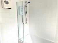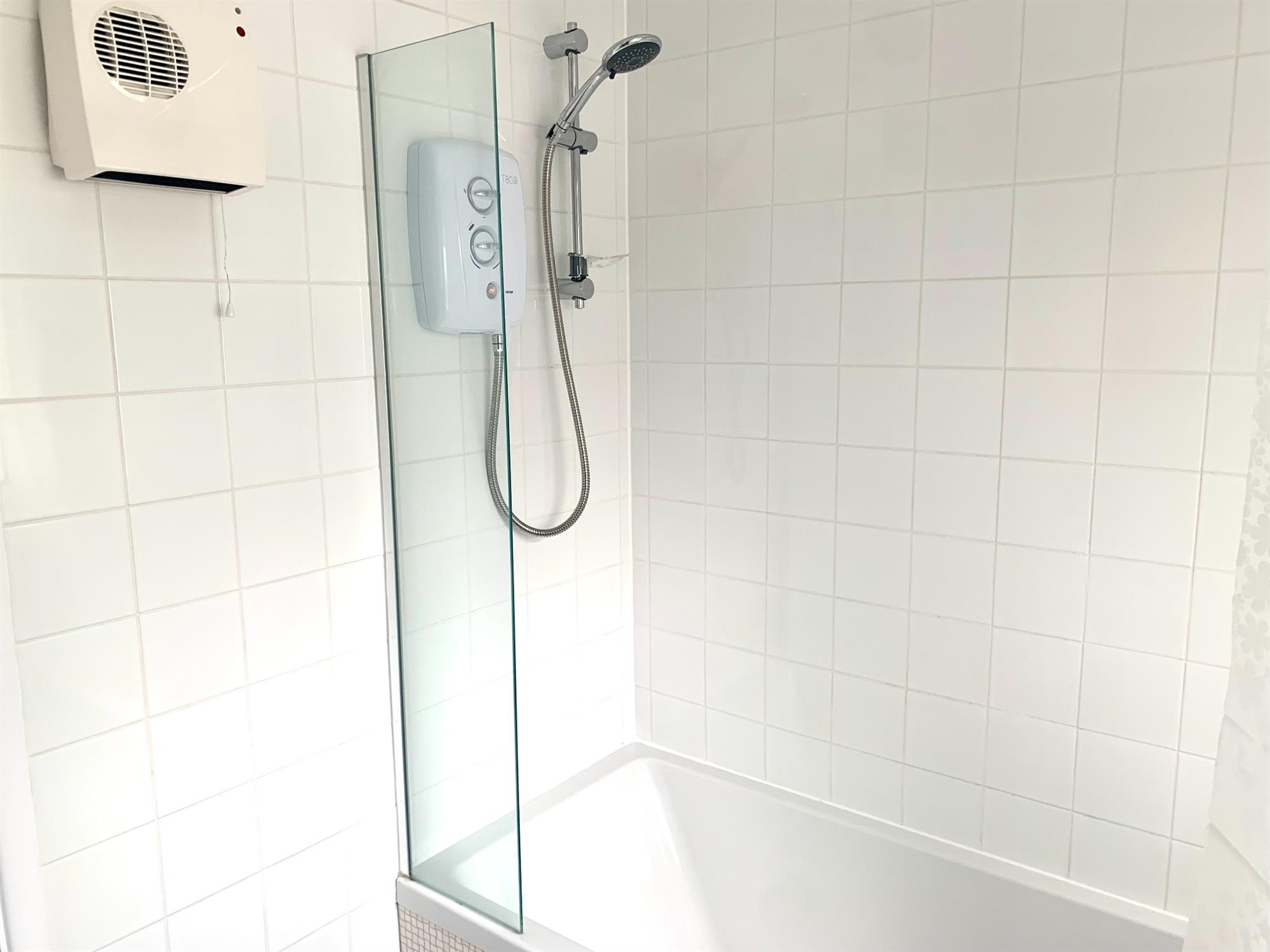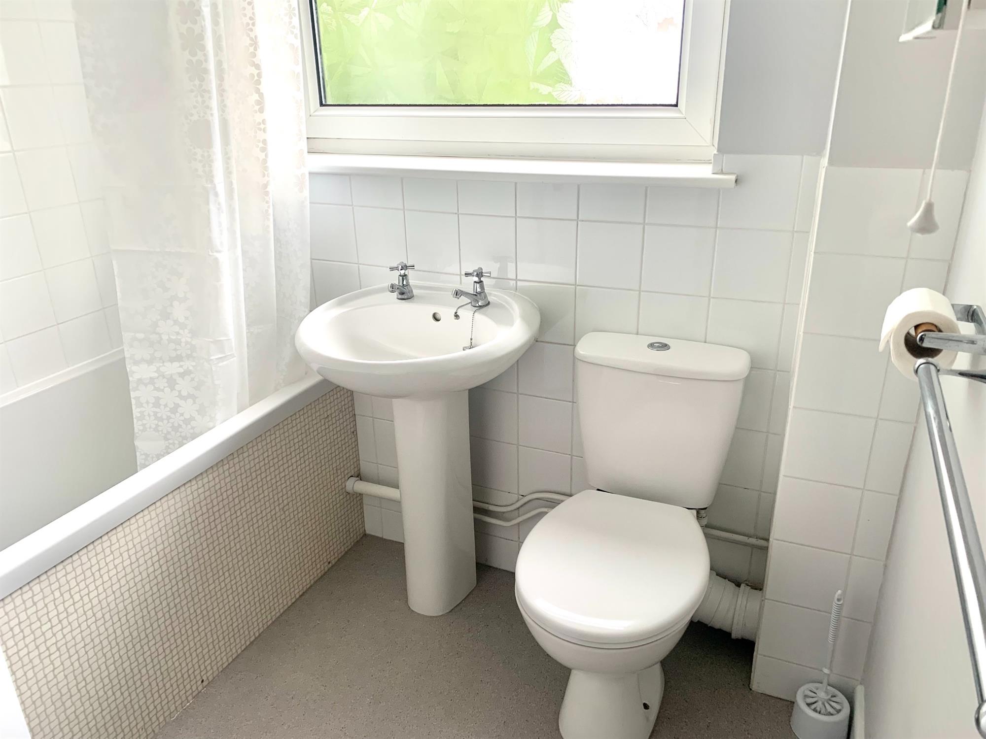 BATHROOM - White suite bathroom with electric shower over bath, sink and toilet. Window to rear.