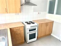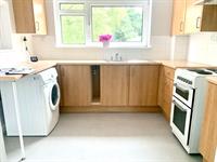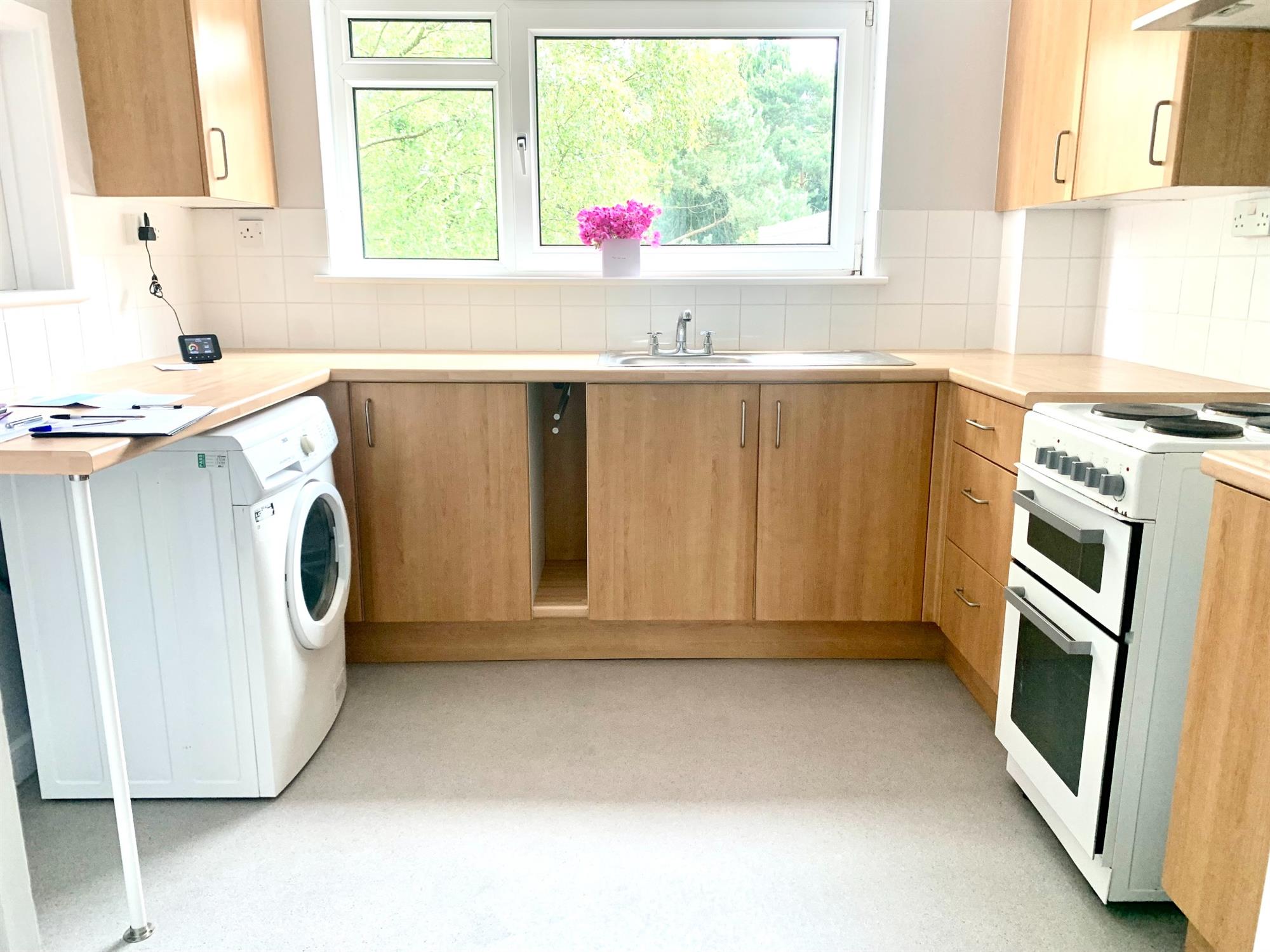 KITCHEN – Various wall and base units with appliances consisting of electric freestanding oven, fridge/freezer and washing machine. Window to rear and serving hatch into lounge/diner.