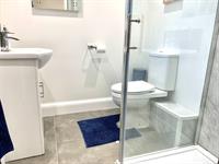 SHOWER ROOM – White suite shower room with shower cubicle, toilet and sink inset in vanity unit. Window to rear.