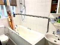 BATHROOM - White suite bathroom with shower over bath, sink and toilet. Window to side.