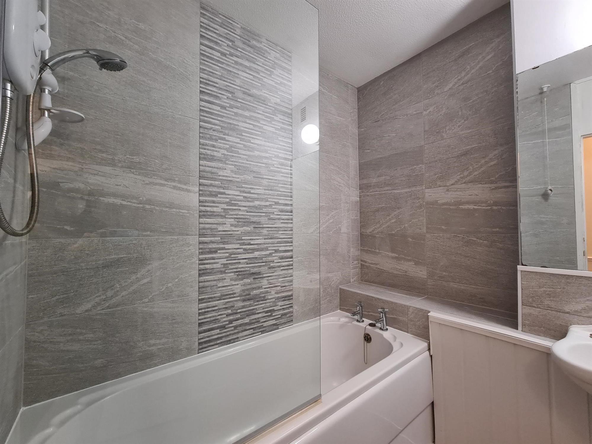 BATHROOM:- White suite with bath, electric shower and basin.