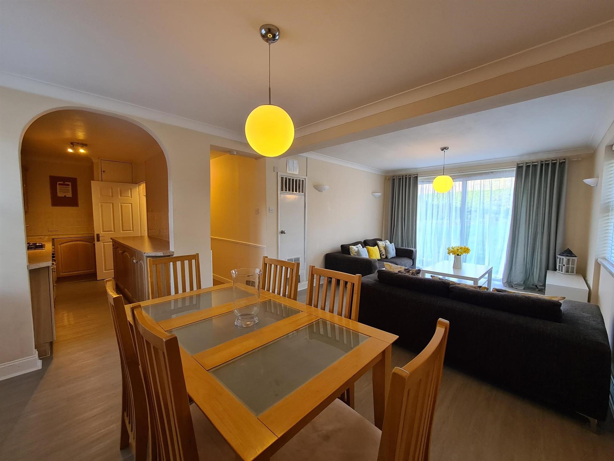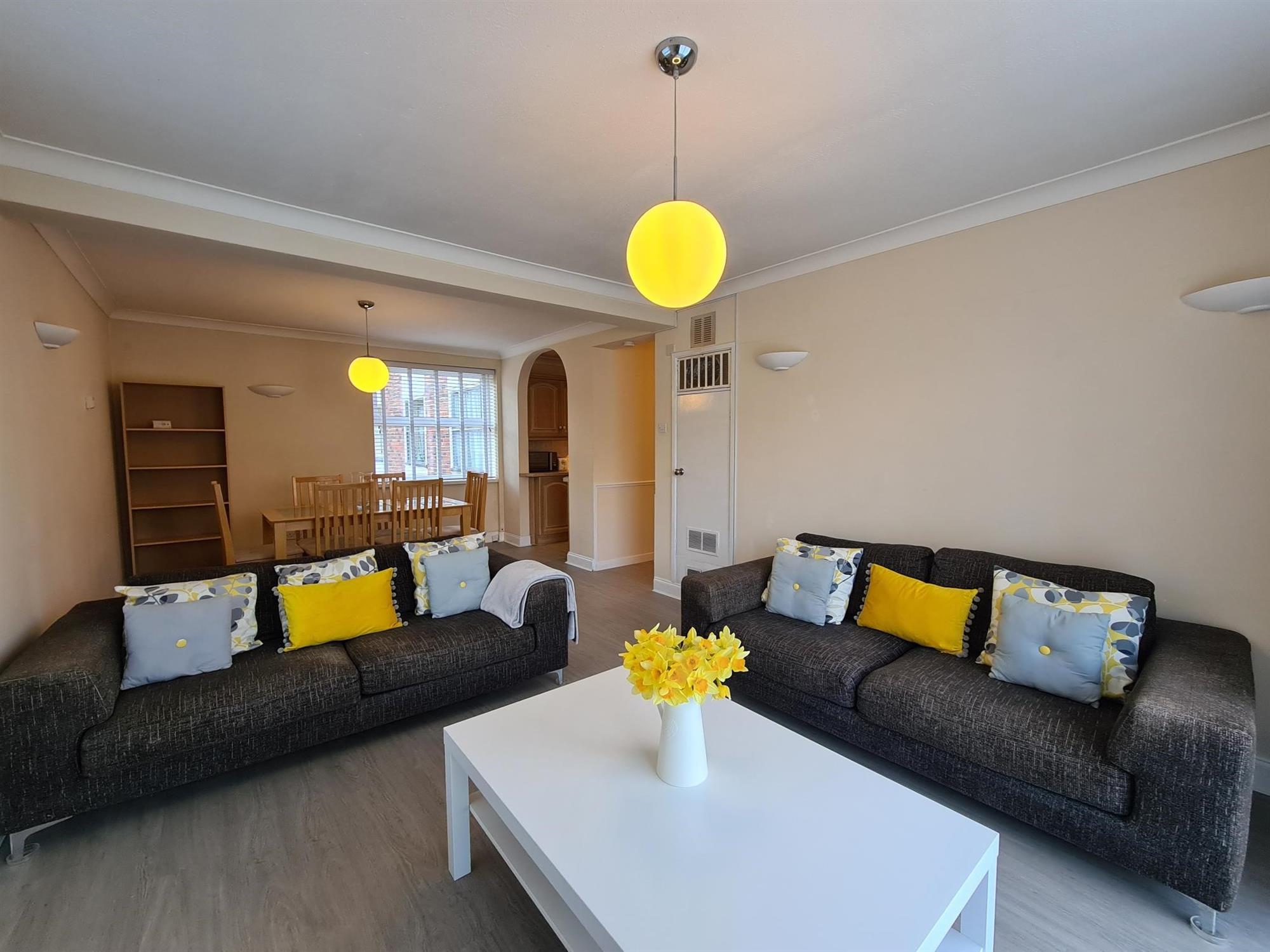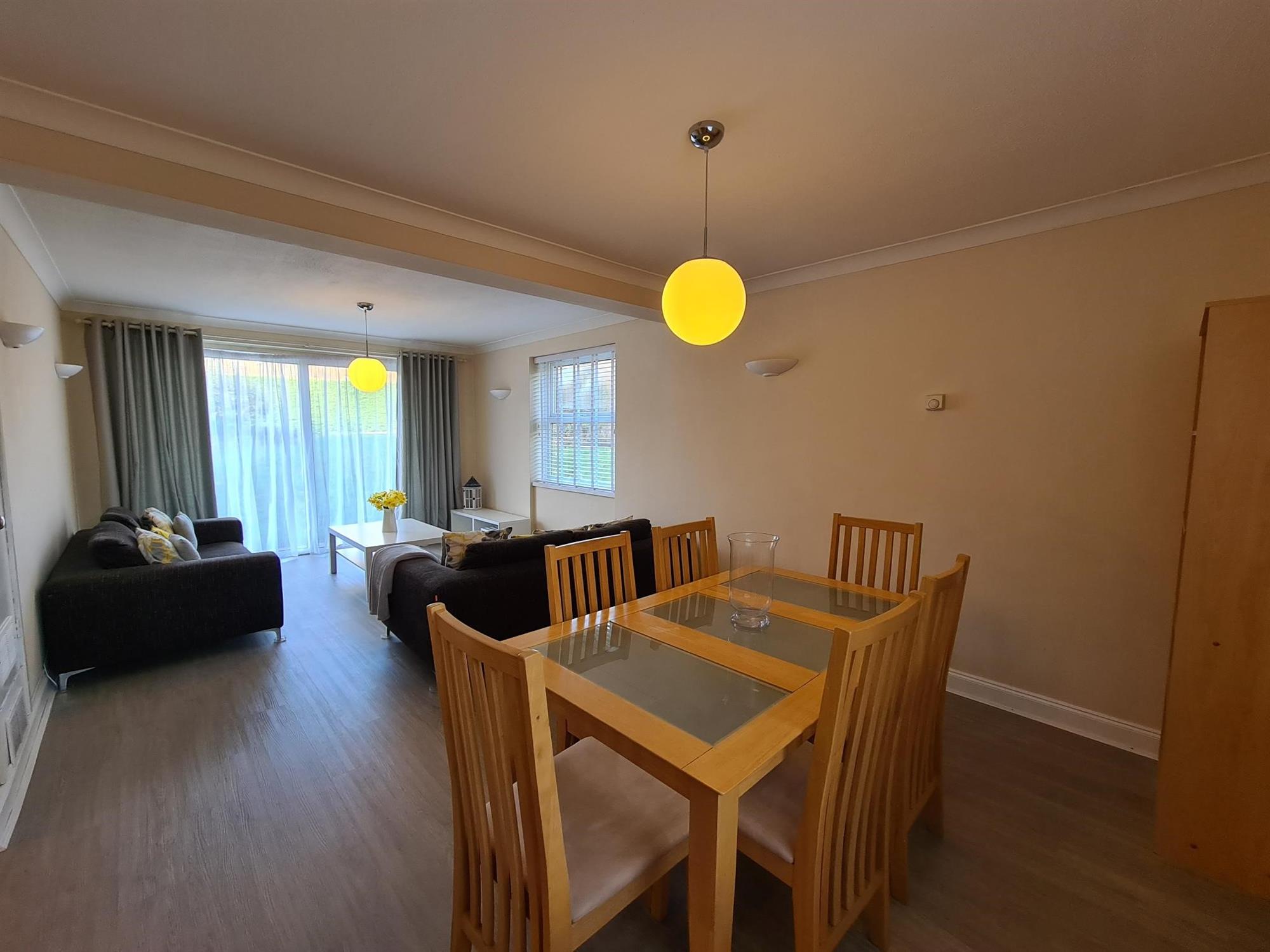 LOUNGE/DINER:- Laminate flooring with french doors to communal garden, window to rear and archway to kitchen. Furniture consists of: 2 x 2 seater sofas, coffee table, tv unit, shelving unit and table and chairs.