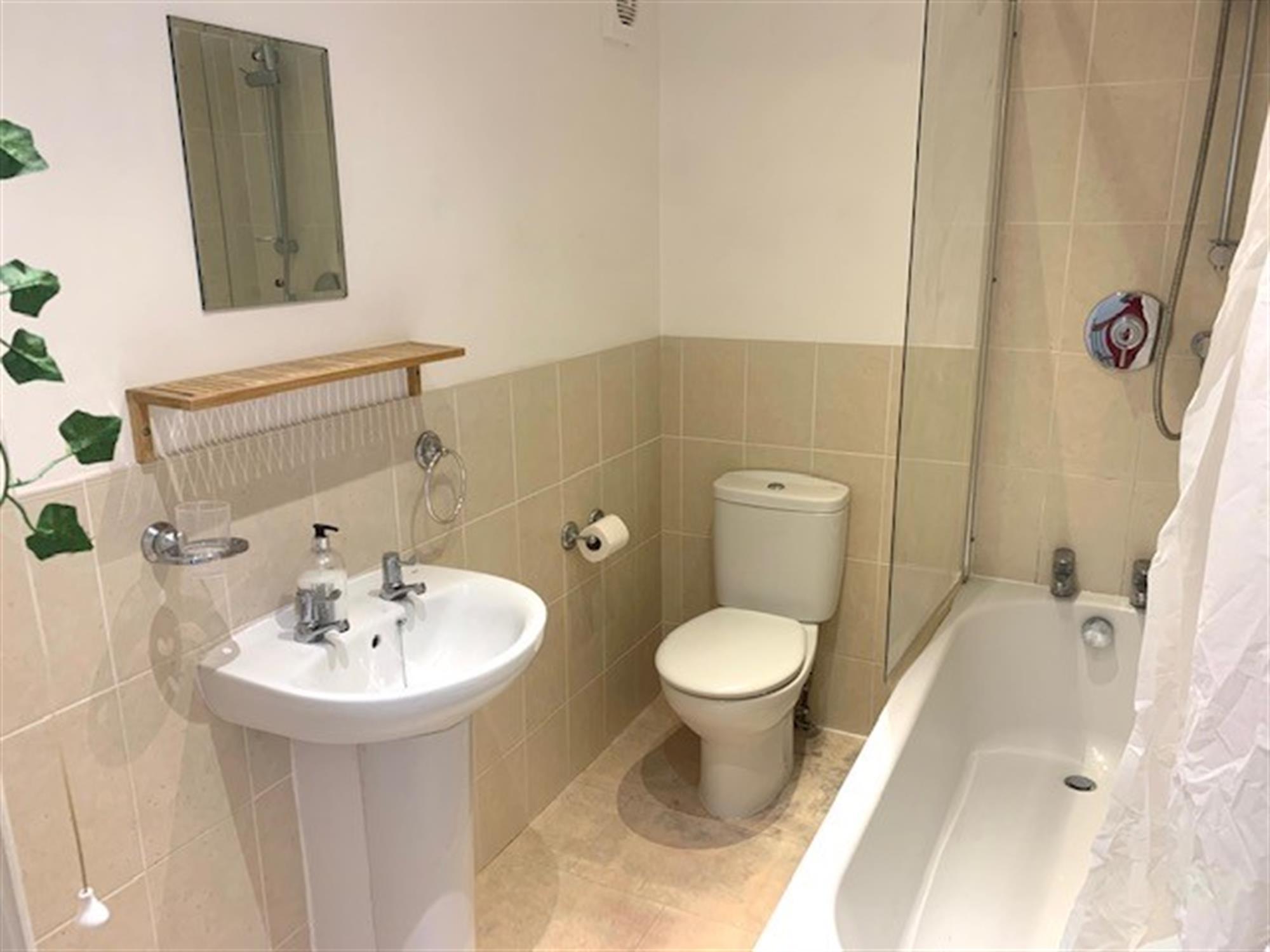 BATHROOM: White suite with basin, toilet and bath with shower over.