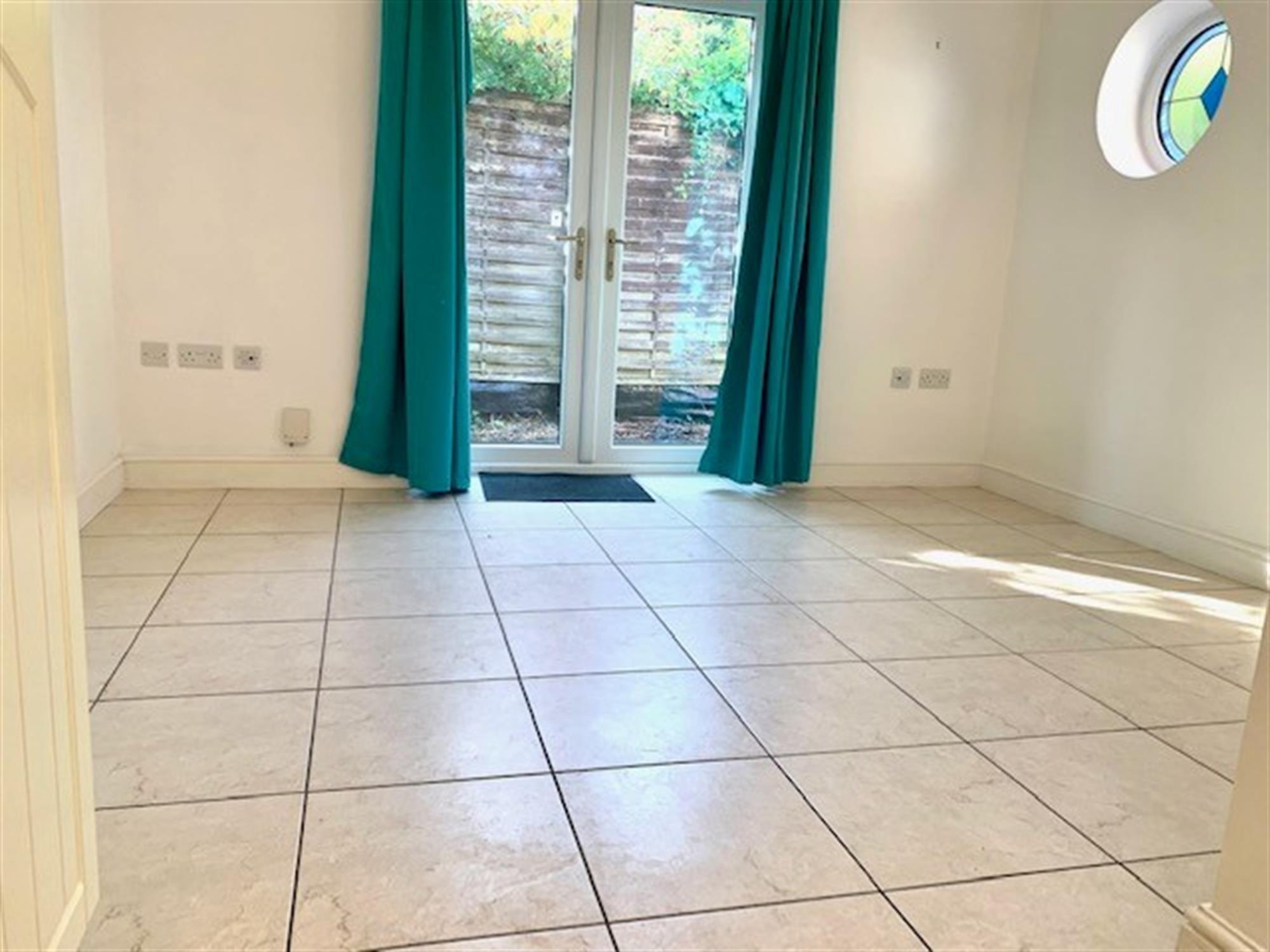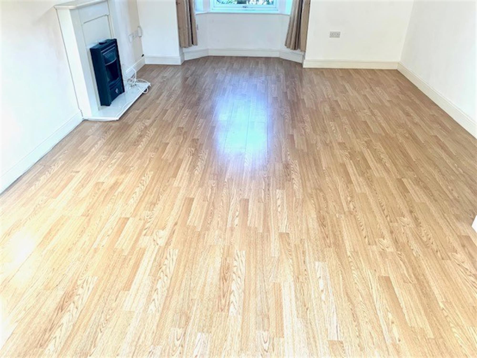 LOUNGE: Laminate flooring. Bay window to front and French doors to garden. Electric fire set in hearth. Cupboard off.