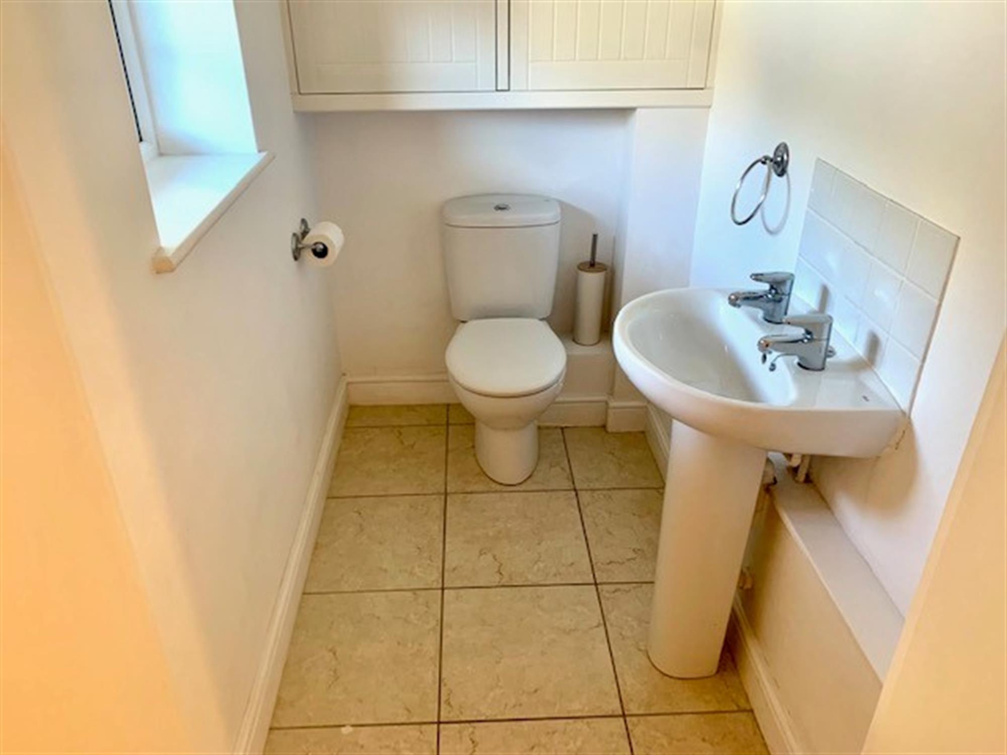 CLOAKROOM: Window to side. Ceramic tiled floor. Wall shelving cupboard. Toilet and basin.