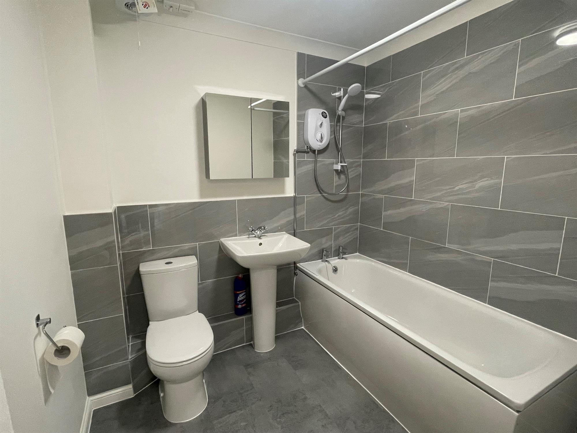 BATHROOM – White suite with bath with electric shower over, sink and toilet.