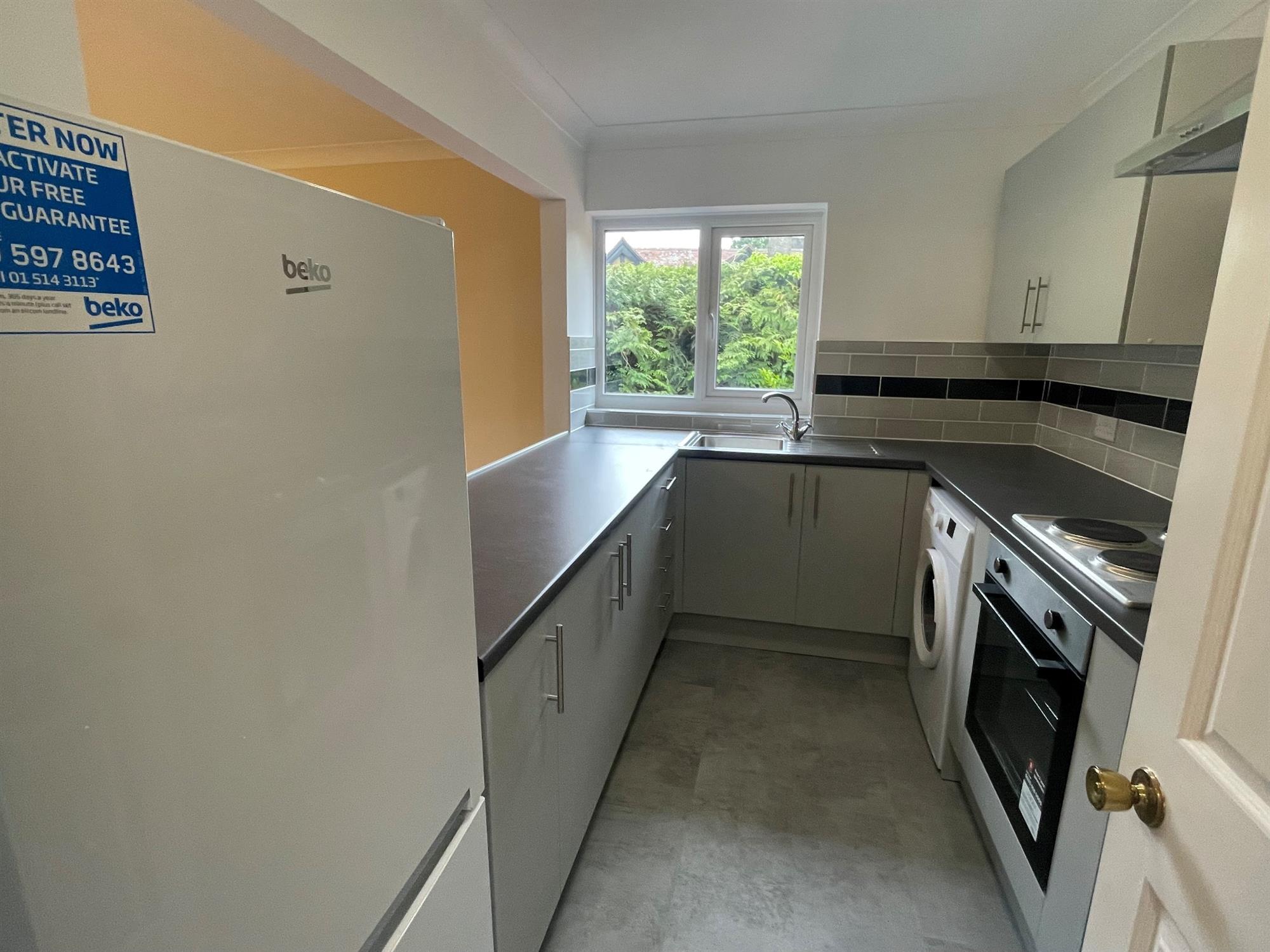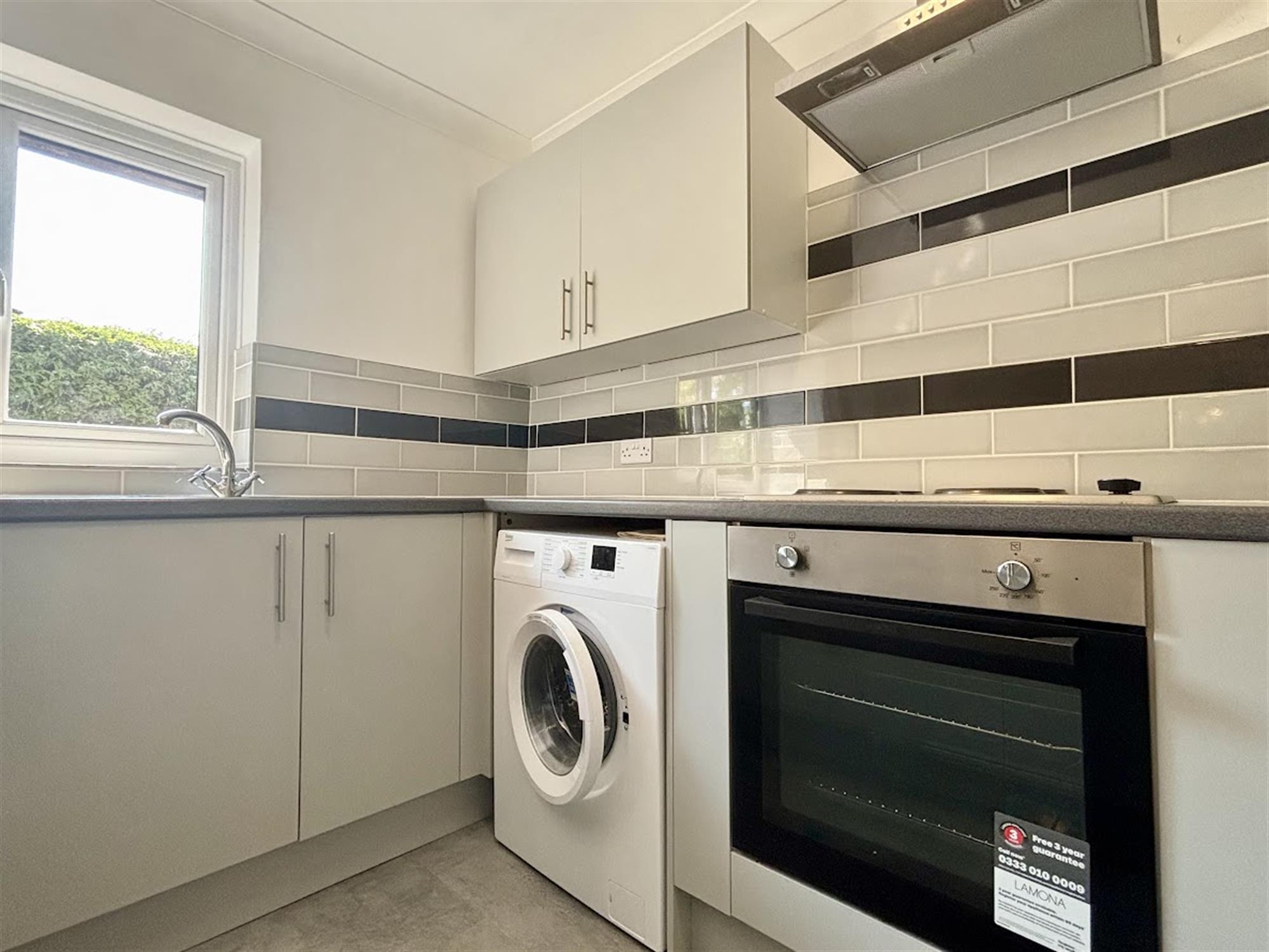 KITCHEN – Various grey modern wall and base units with window to the side. Appliances consist of: electric oven, electric hob, washing machine and fridge/freezer.