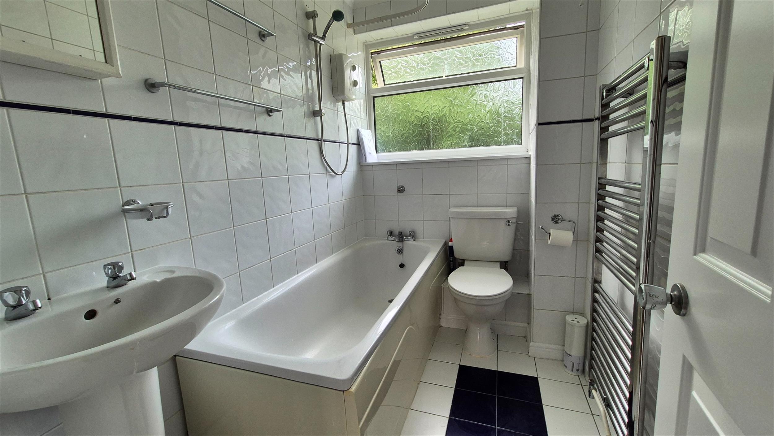 BATHROOM - White suite bathroom with sink, toilet and electric shower over bath. Window to rear.