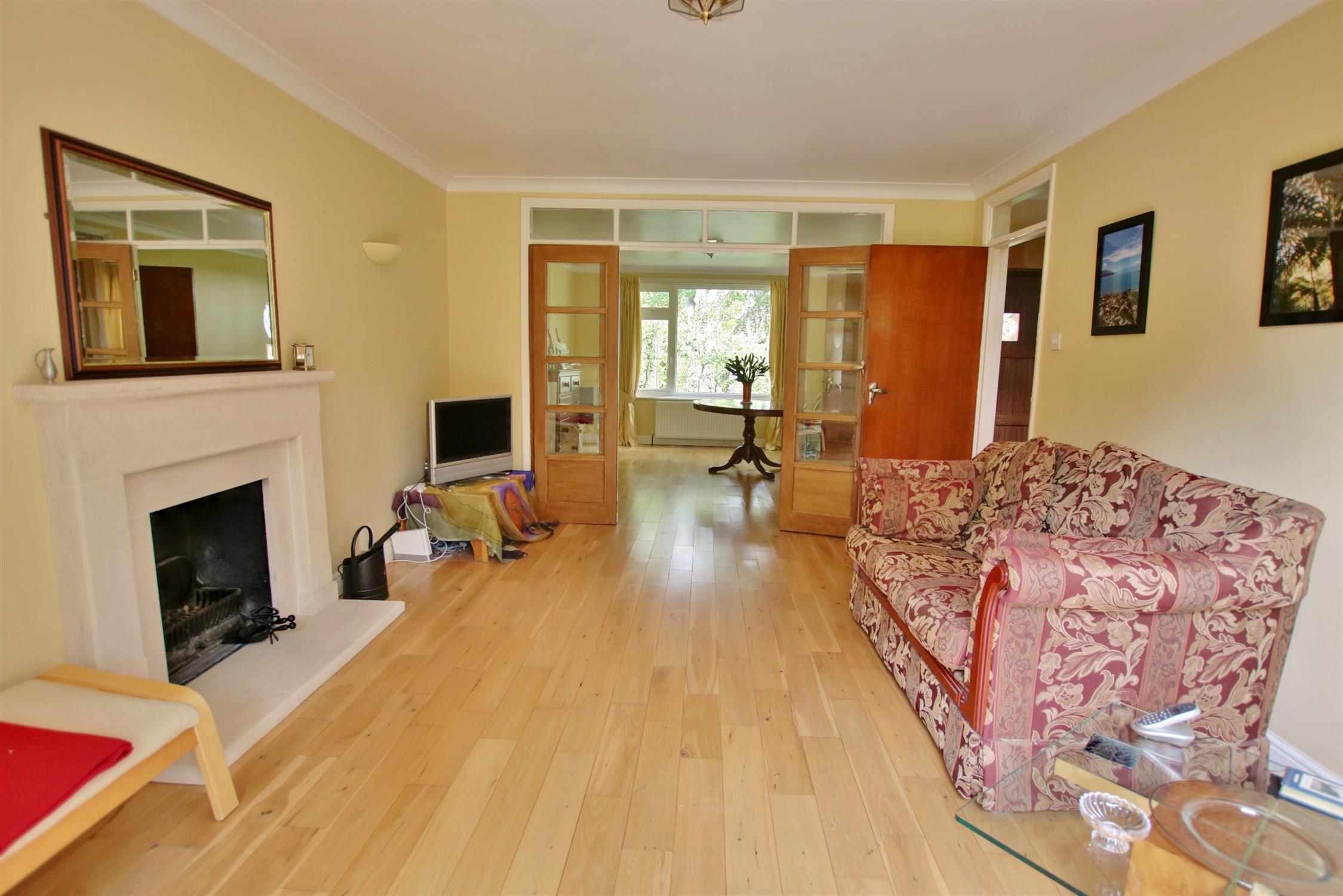 Double glazed French doors with double glazed side window opening onto rear aspect. Circular window to side aspect. Double doors opening to dining room. Coving to smooth ceiling. Feature open fireplace. Radiator. Oak flooring.