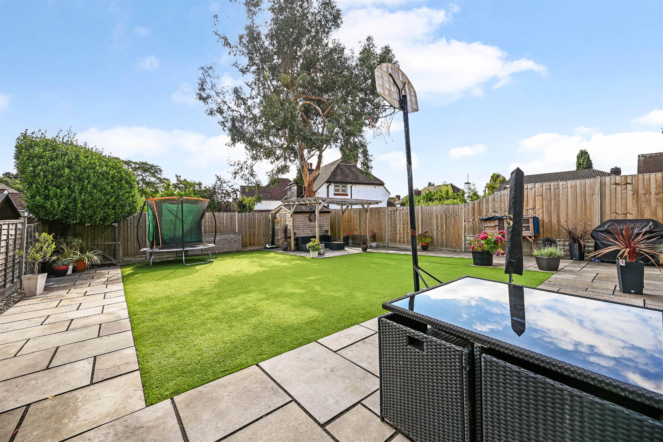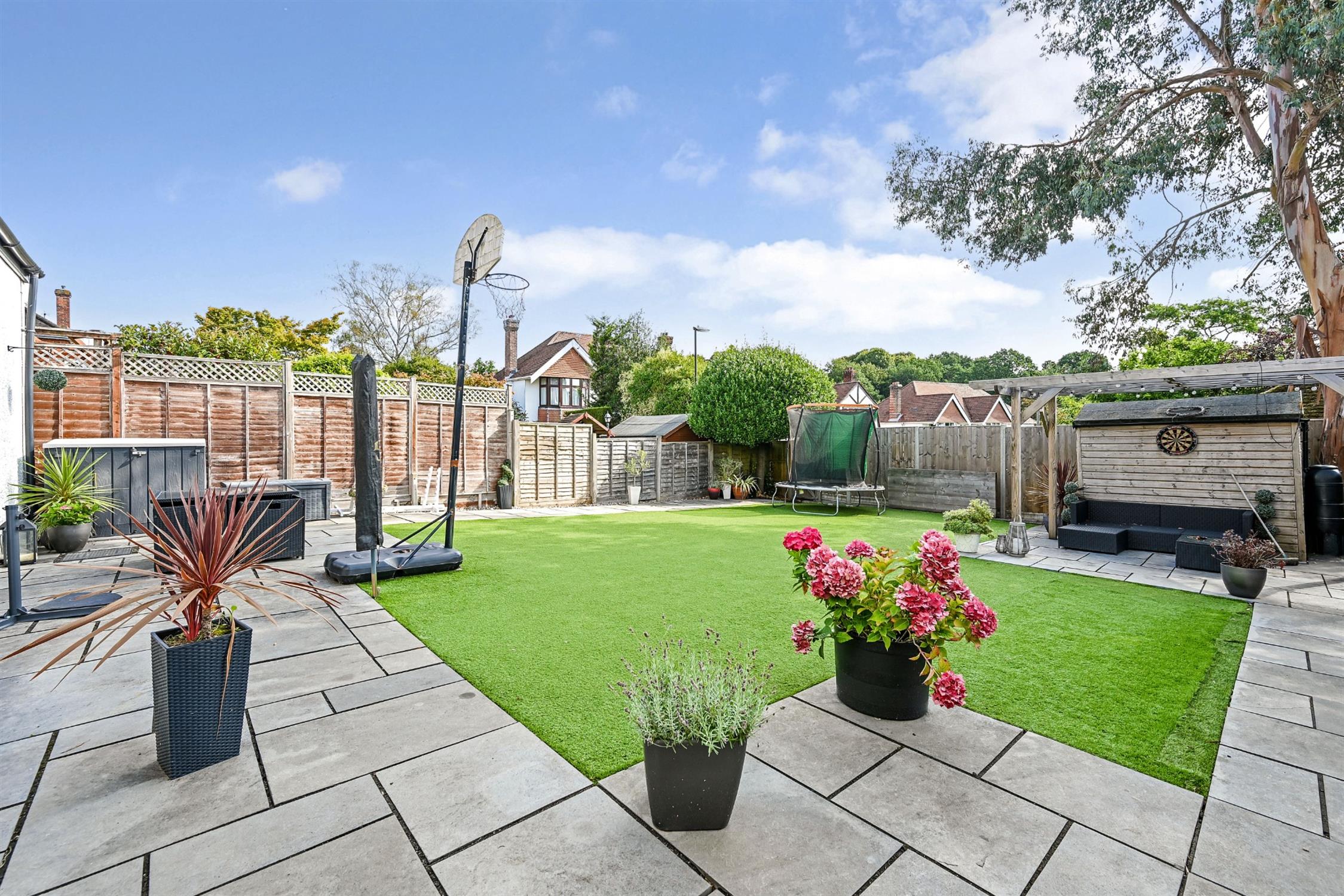 The rear garden has been laid to a low maintenance style and includes a large area of artificial grass. Comprehensive scoping and re-modelling to include a large dark stone paved patio area with matching pathways leading to the perimeter of the lawn giving access to the detached shed also leading to the rear pedestrian access. The gardens are enclosed by fence panelling.