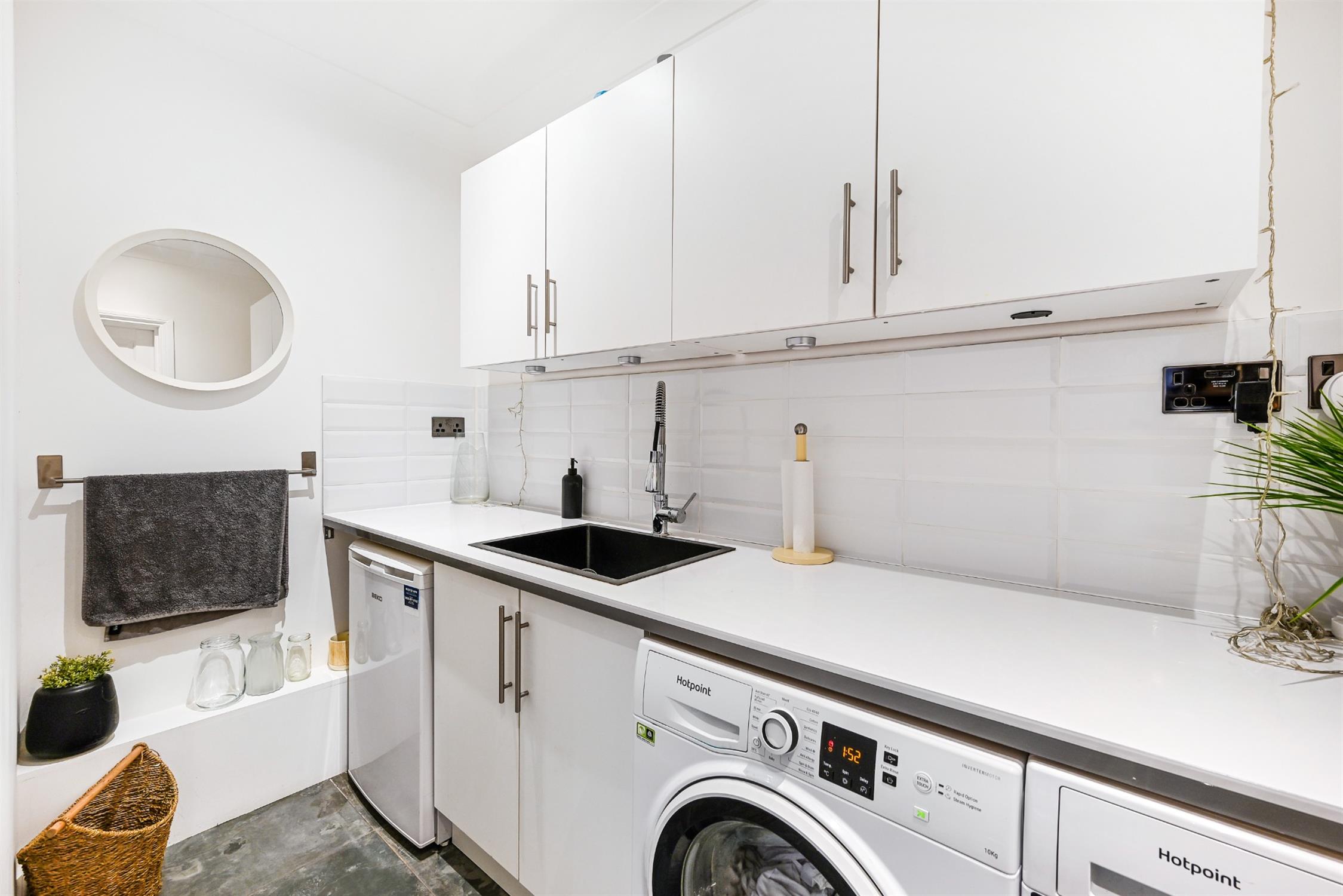 The kitchen has been finished in an ultra contemporary style with a range of high gloss, eye and base level units and an outstanding central island feature. Kick board floor mounted lighting. Integrated dishwasher. Range of further appliances to include wine cooler, 'AEG' oven, built-in 'AEG' microwave oven and coffee machine. Integrated 'Neff' five burner gas hob with feature extractor hood over. Glass splashbacks to worktop surfaces. Deep pan drawers. Space and plumbing for American style fridge/freezer. Underlaid one and a half bowl sink unit with flexi hose tap. Built-in bin drawer. Downlighting to high level cupboards. Radiator. Double glazed windows and double doors leading to the rear garden. Gloss finished ceramic tiling.