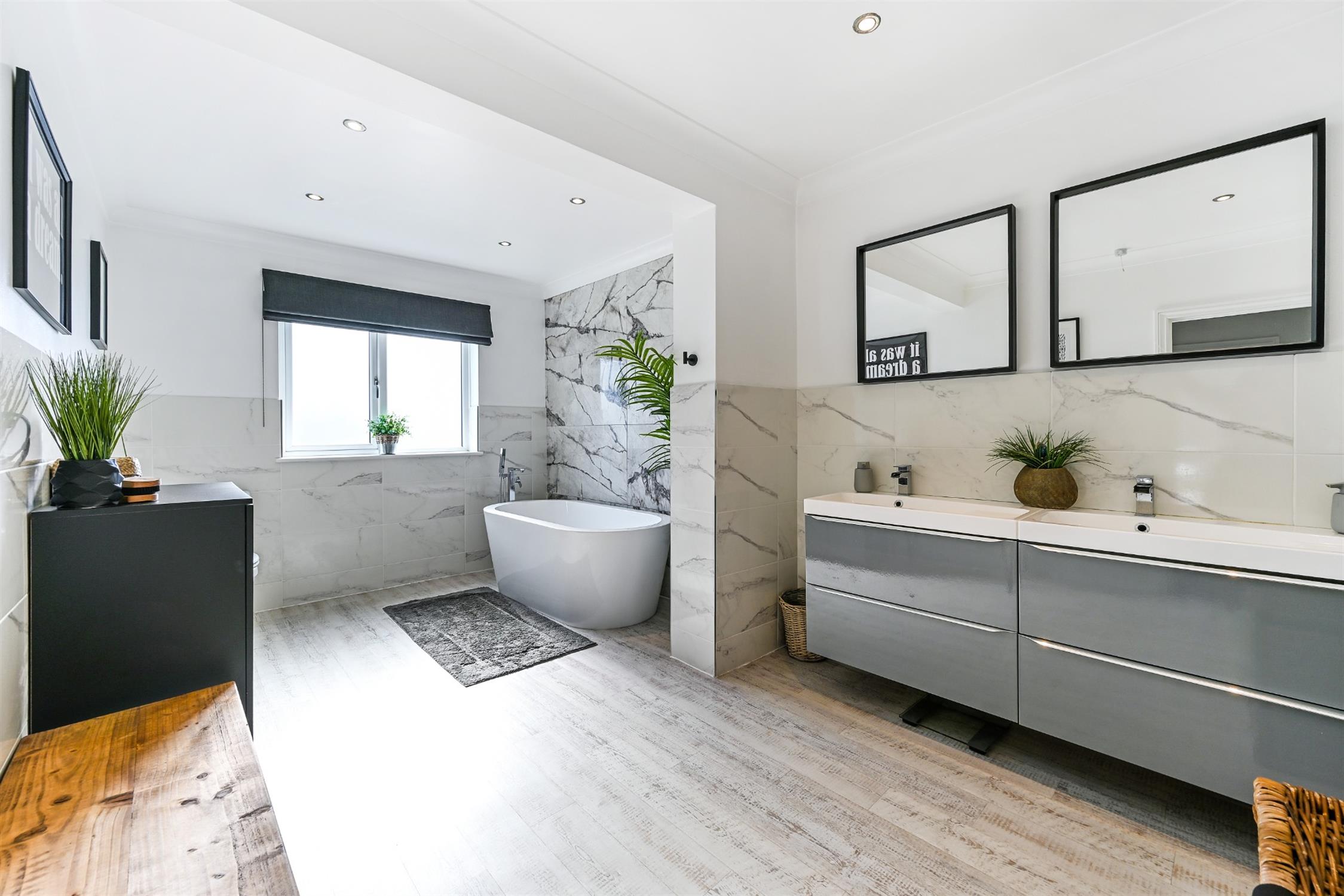 A luxuriously appointed suite comprising: his & hers vanity hand basins, an extremely generously proportioned dual ended panelled bath with centrally located mixer tap fitting and hair washing attachment, low level w.c. with dual flush. Wall mounted chrome towel rail. Obscure double glazed window. Smooth plastered and coved ceiling with recessed halogen lighting.
