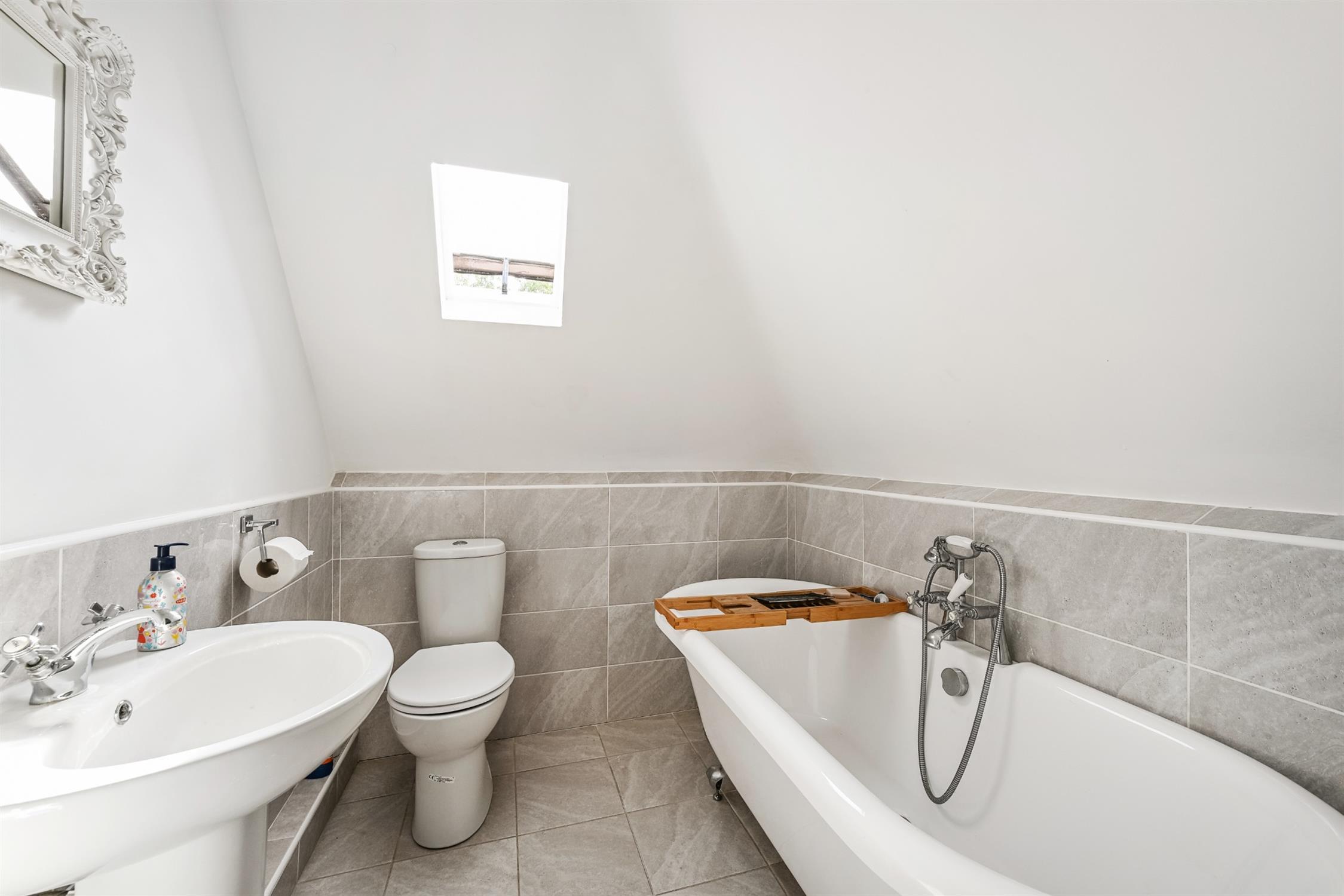 A delightfully appointed three piece suite comprising: low level w.c. with dual flush, pedestal wash hand basin and roll top claw foot free-standing bath. Natural light provided by ceiling mounted lantern light. Heated chrome towel rail.