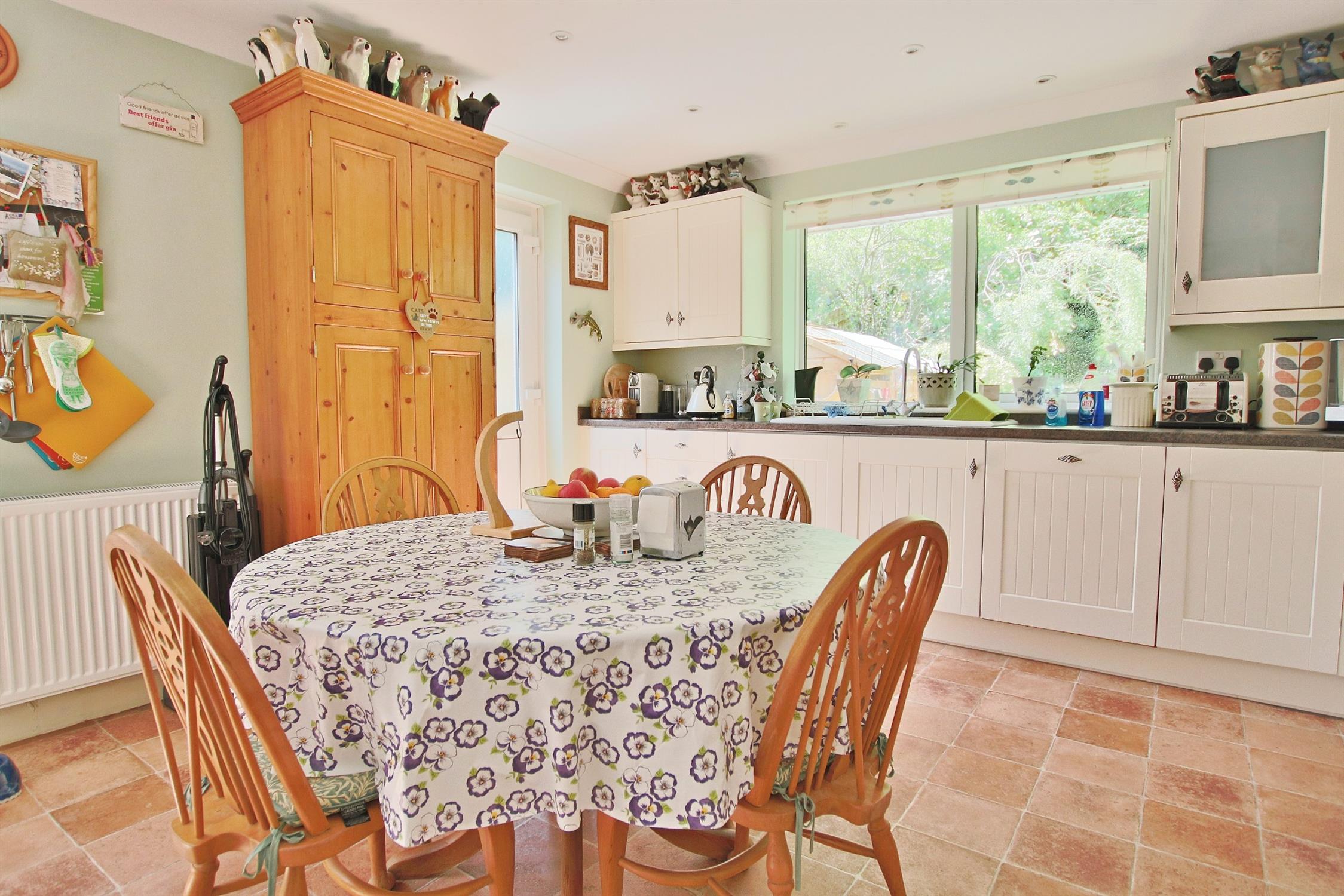 A thoughtfully appointed and well planned kitchen/dining room offers ample seating for formal dining and has been re-fitted and up-graded. The gardens are extensive with mature plantings to the front and rear elevations offering a good degree of privacy and a driveway provides parking for numerous vehicles. The rear garden is laid partially to lawn with extensive patio area as well as well stocked borders and planted areas.