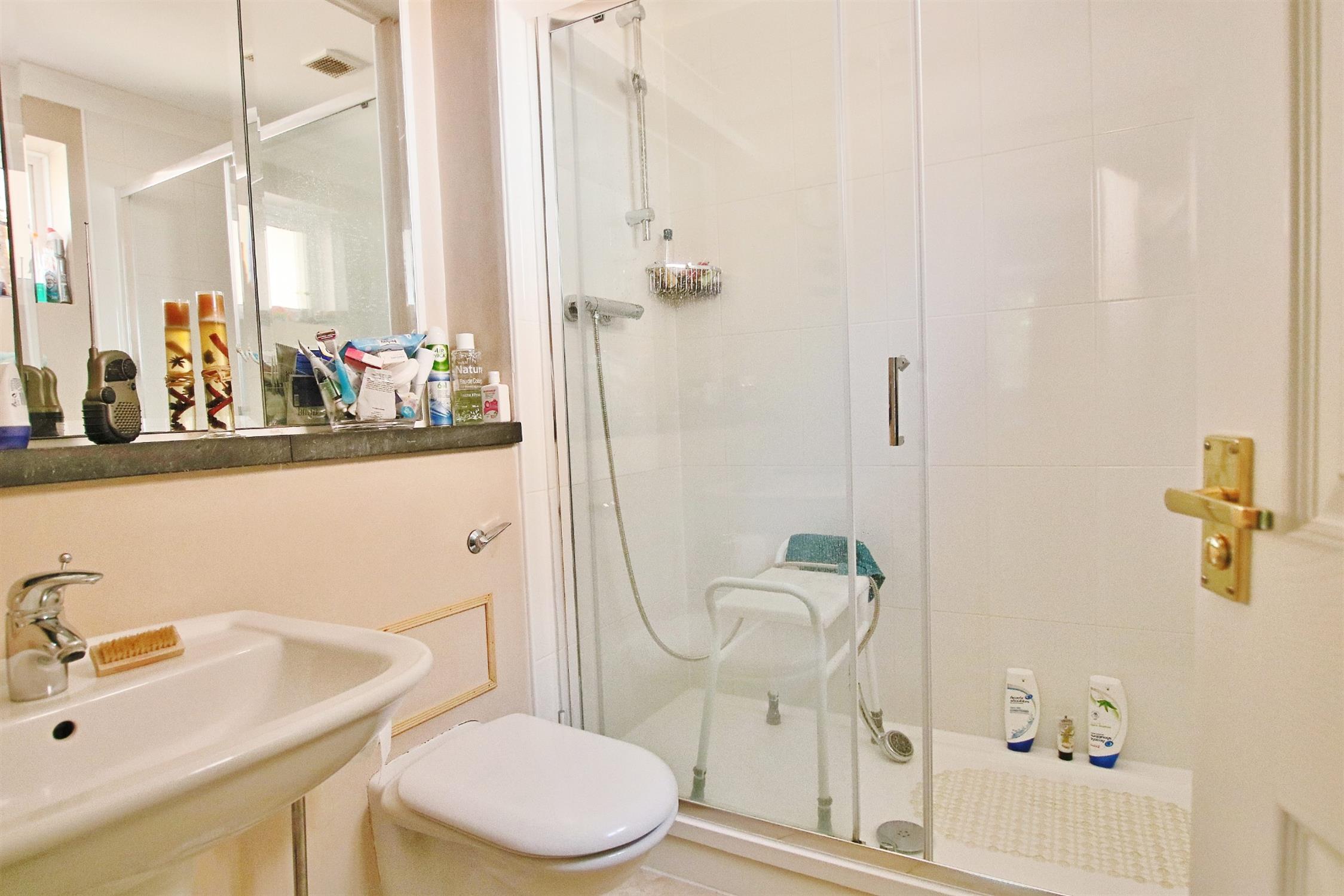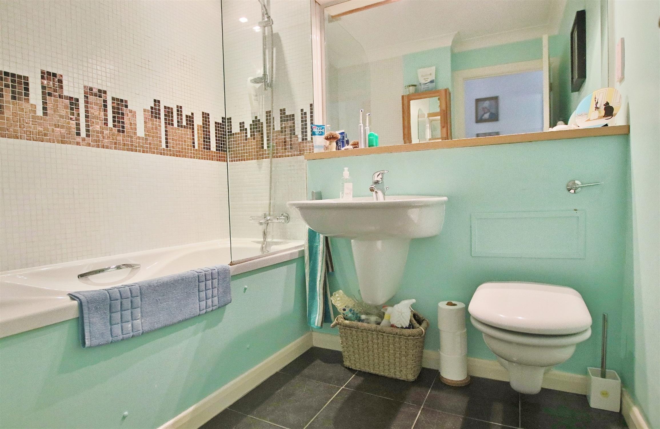 Three piece suite comprising: low level w.c., pedestal wash hand basin and shower enclosure with separate shower. Smooth plastered and coved ceiling. Obscure double glazed window. Chrome finish towel rail.