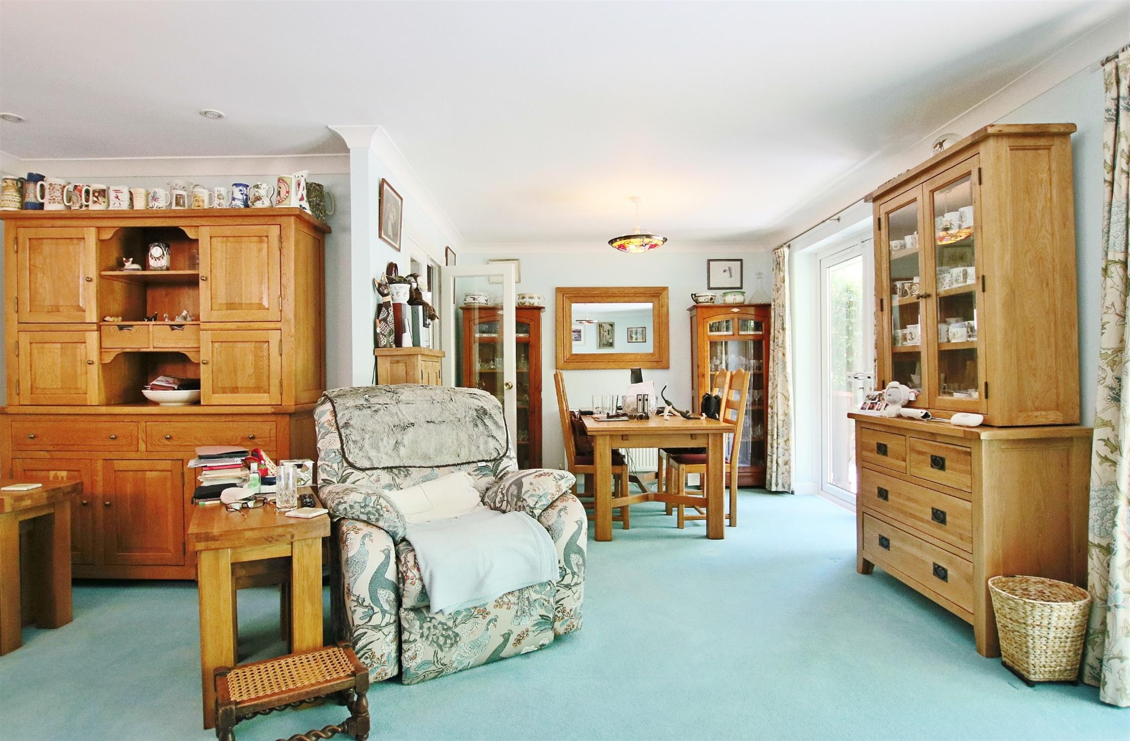 Smooth plastered and coved ceiling with twin double glazed double doors leading to the rear garden. Double glazed window to side elevation. Double doors leading back to landing area. Two radiators.