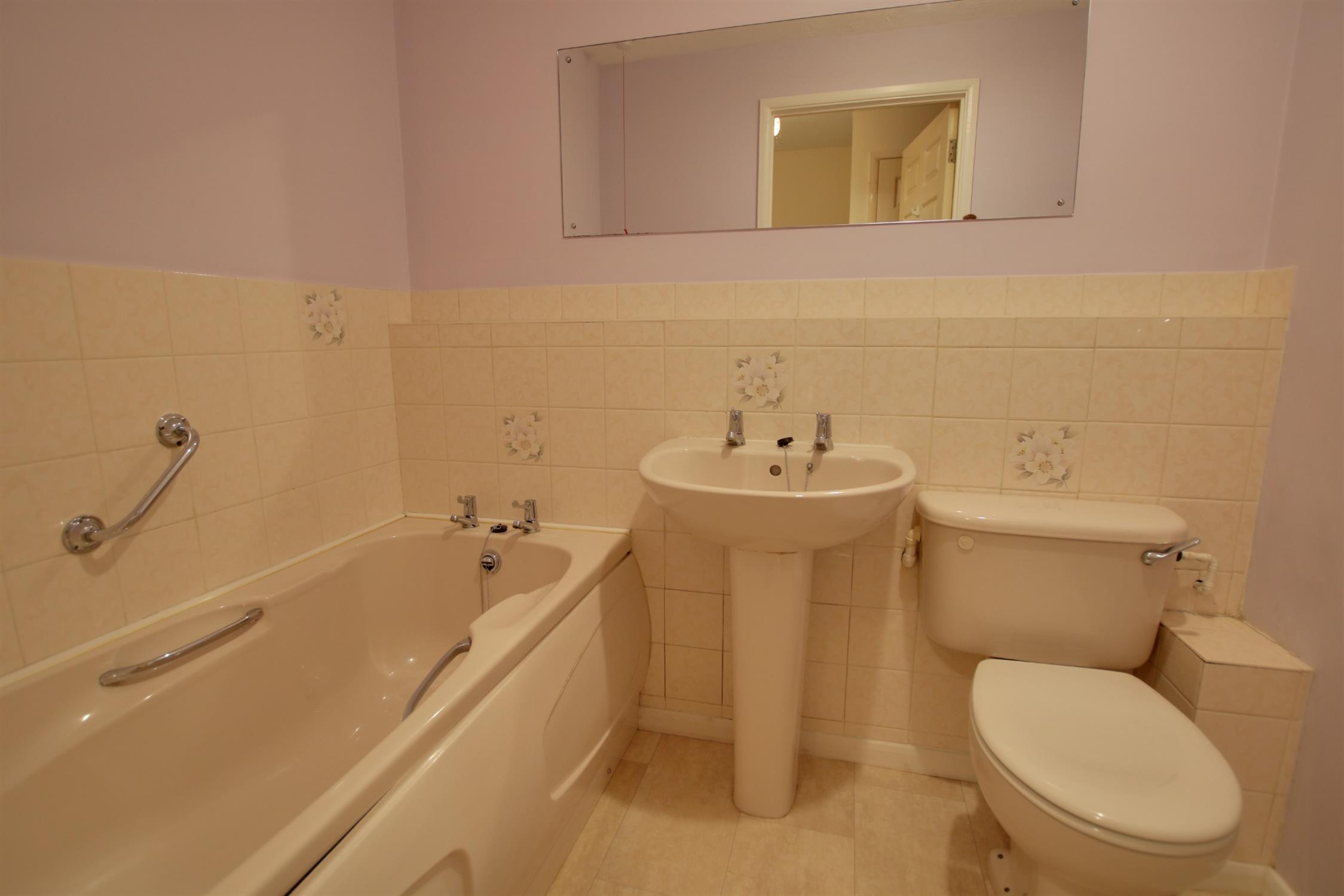 Textured ceiling. Extractor. Panel enclosed bath, low level flush w.c. and pedestal wash hand basin. Part tiled walls. Emergency pull cord. Electric panel heater.