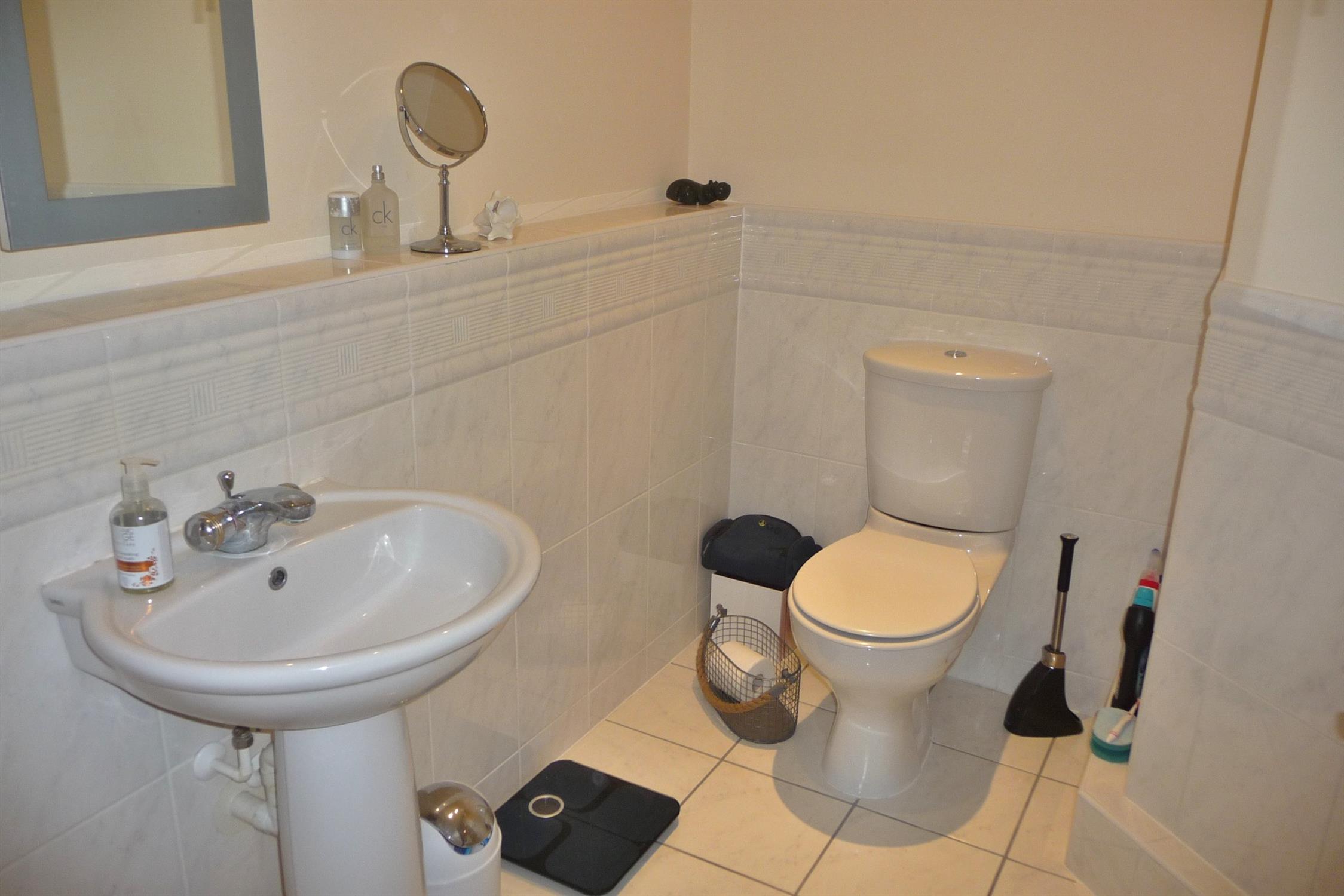 Smooth ceiling with inset spotlights. Extractor. Tiled double shower cubicle, pedestal wash basin and low level flush w.c. Part tiled walls. Tiled floor. Radiator. Shaver point.