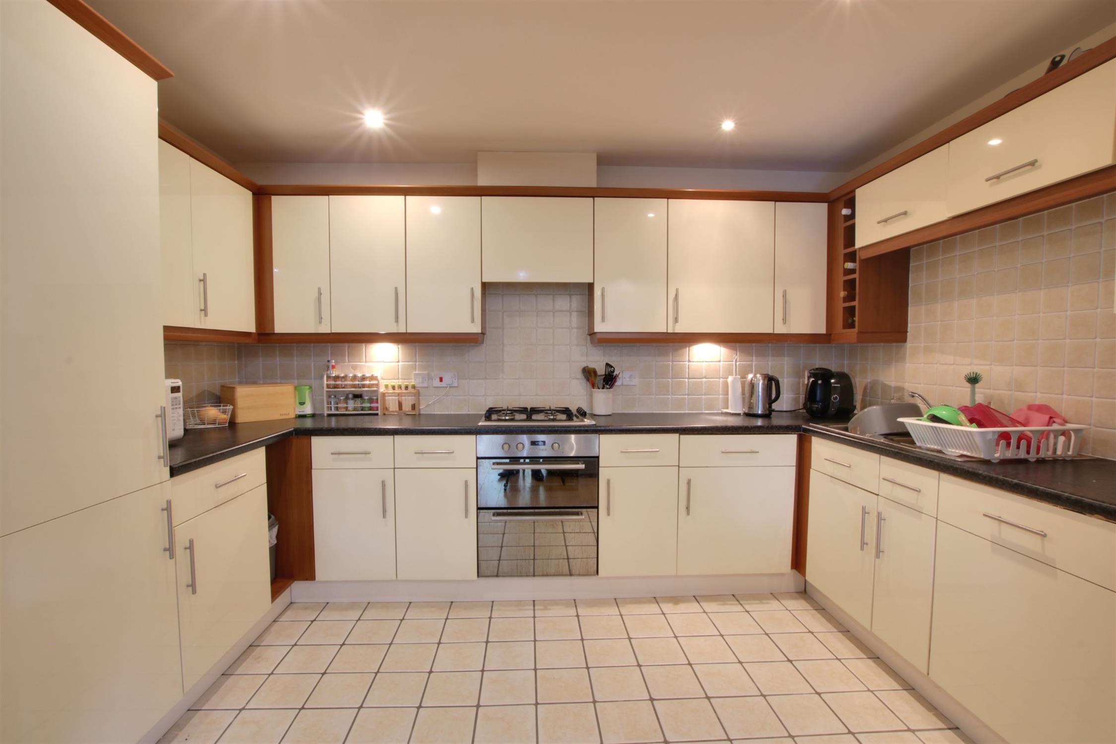 Smooth ceiling with inset spotlights. Single drainer one and a half bowl sink unit with mixer tap and cupboard under. Integrated fridge/freezer, washer dryer and dishwasher. Built-in double oven with four ring gas hob and extractor over. Range of matching eye level and base mounted units with roll top work surfaces. Part tiled walls. Tiled floor.