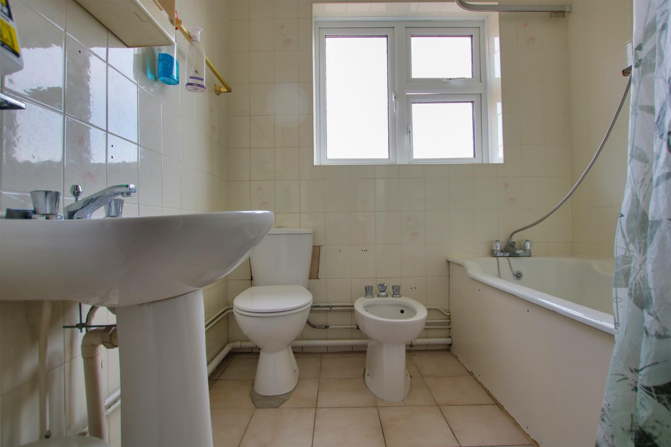 Tiled walls and flooring. Obscure window to easterly aspect. Panelled bath with mixer tap over, bidet, ceramic wash basin and w.c. Smooth ceiling.
