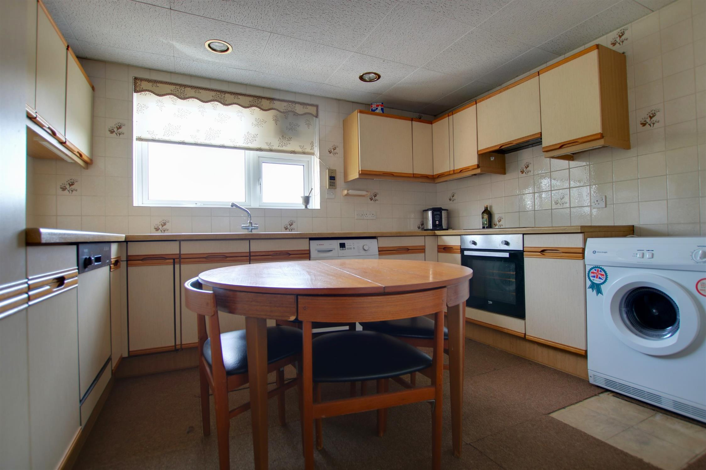 Matching wall and base units with worktop over. Double glazed window to easterly aspect. Sink and drainer. Electric oven. Induction hob. Tiled splash backs. Polystyrene tiled ceiling. Integrated dishwasher. Space for washing machine and tall standing fridge/freezer.