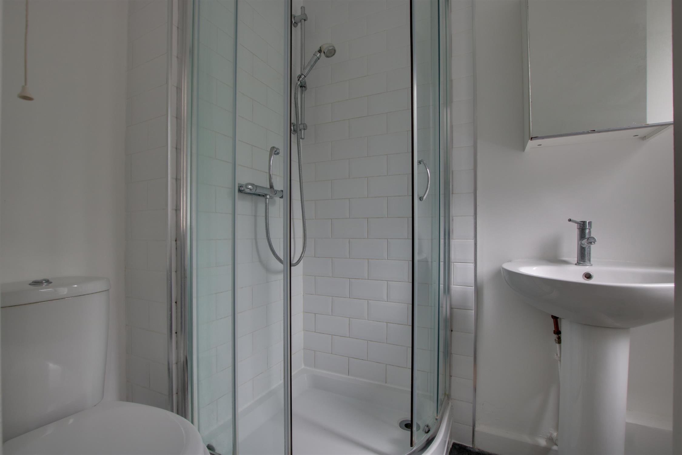 Laminate flooring. Partially tiled walls. Shower cubicle. Low level W.C and basin. Obscure single-glazed window to side aspect.