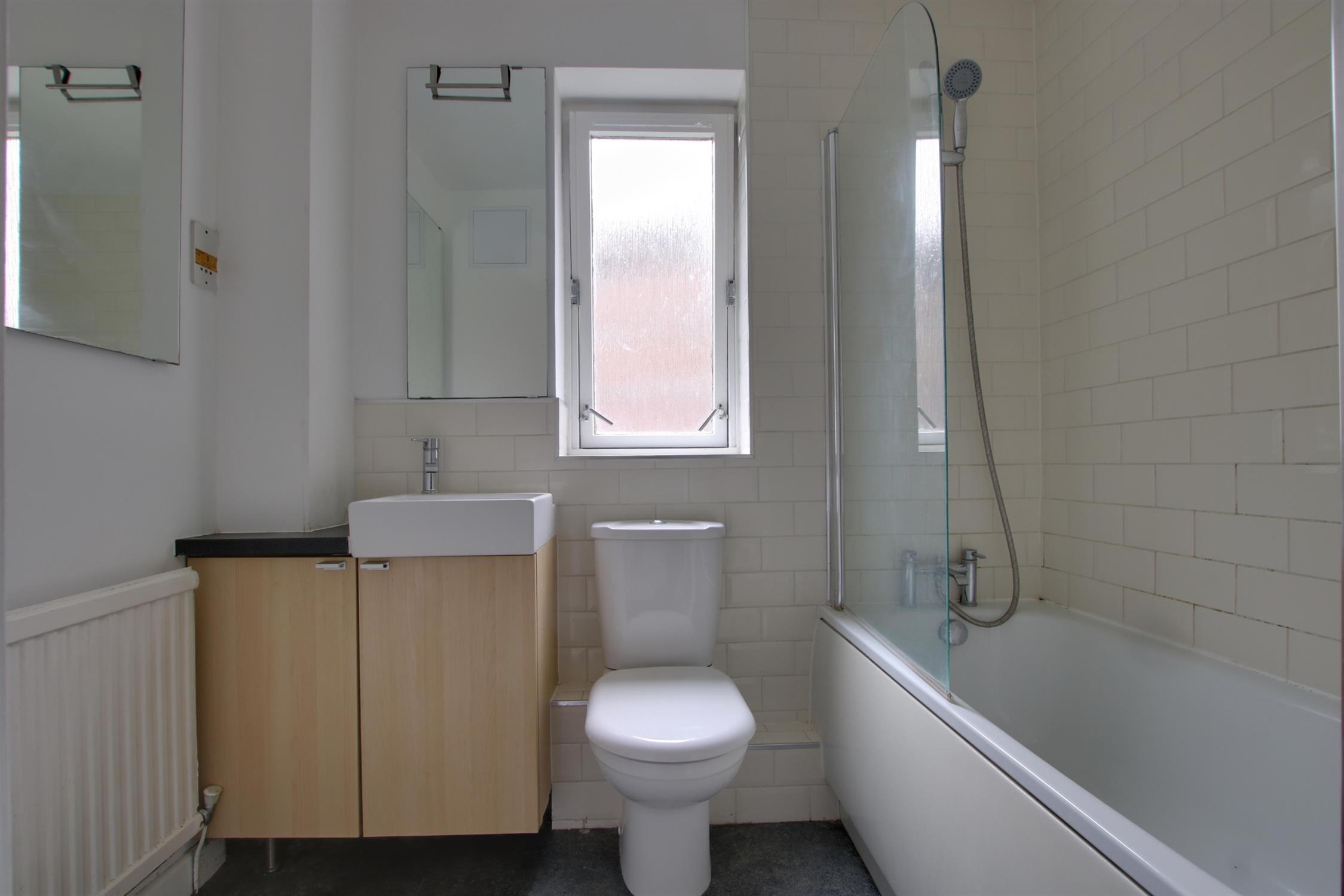 Laminate flooring. Partially tiled walls. Panel enclosed bath with shower head attachment. Low level W.C and basin. Cupboard housing hot water tank. Obscure double-glazed window to side aspect. Radiator.