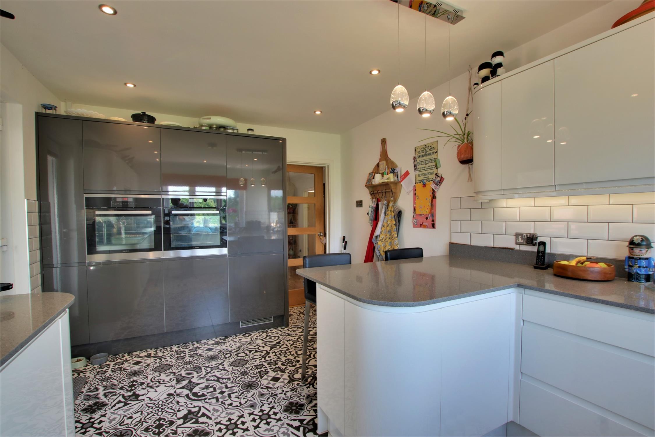 The kitchen has been re-fitted by the current owners in a very contemporary style with a comprehensive range of eye and base level units with quartz work surfaces. Integrated drainer with underlaid sink and swan neck mixer tap fittings. Breakfast bar area. The kitchen is well applianced with twin ovens, electric hob and extractor hood over. Integrated fridge/freezer and dishwasher. Floor mounted kick space convector heater. Radiator. Metro tile finish splash backs and double glazed door leading to:-