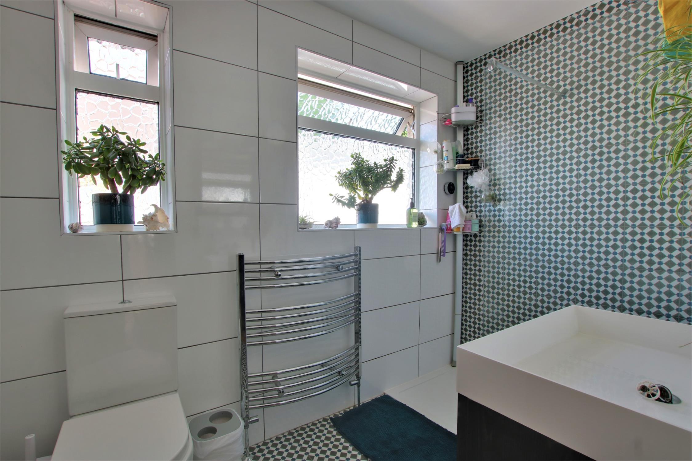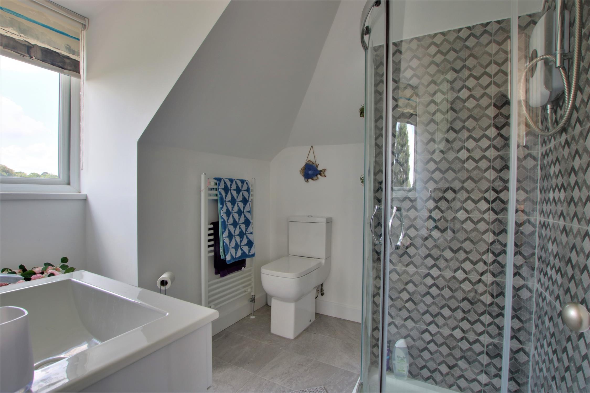 The shower room is fitted in a contemporary style and has been re-modelled by the current owners. A superb over-sized double width walk-in shower with shower screen and rainfall shower head, low level w.c. and rectangular wash basin with vanity unit under. Chrome finish curved ladder style heated towel rail. Obscure double glazed windows. Smooth plastered ceiling. Extractor fan and inset lighting. Tiled wall surfaces. Tiled flooring.