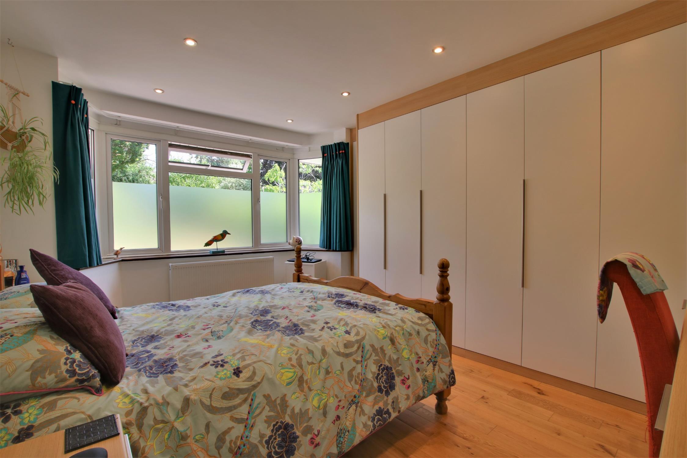 Smooth plastered ceiling with inset lighting and double glazed dormer window. Multiple access points to eaves storage. Integrated built-in drawer storage. Built-in wardrobes fitted by Sharps. Radiator.