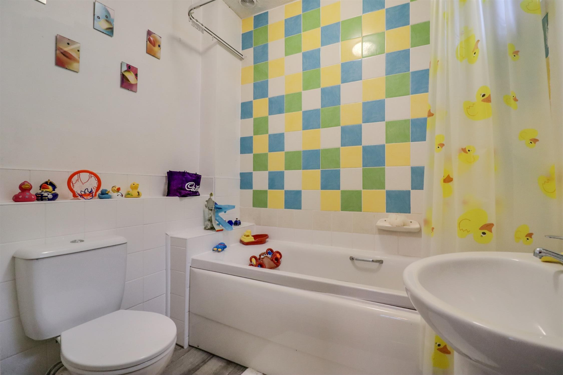 Panel enclosed bath with mixer tap, low level flush w.c. Pedestal sink. Radiator. Tiled walls. Laminate flooring