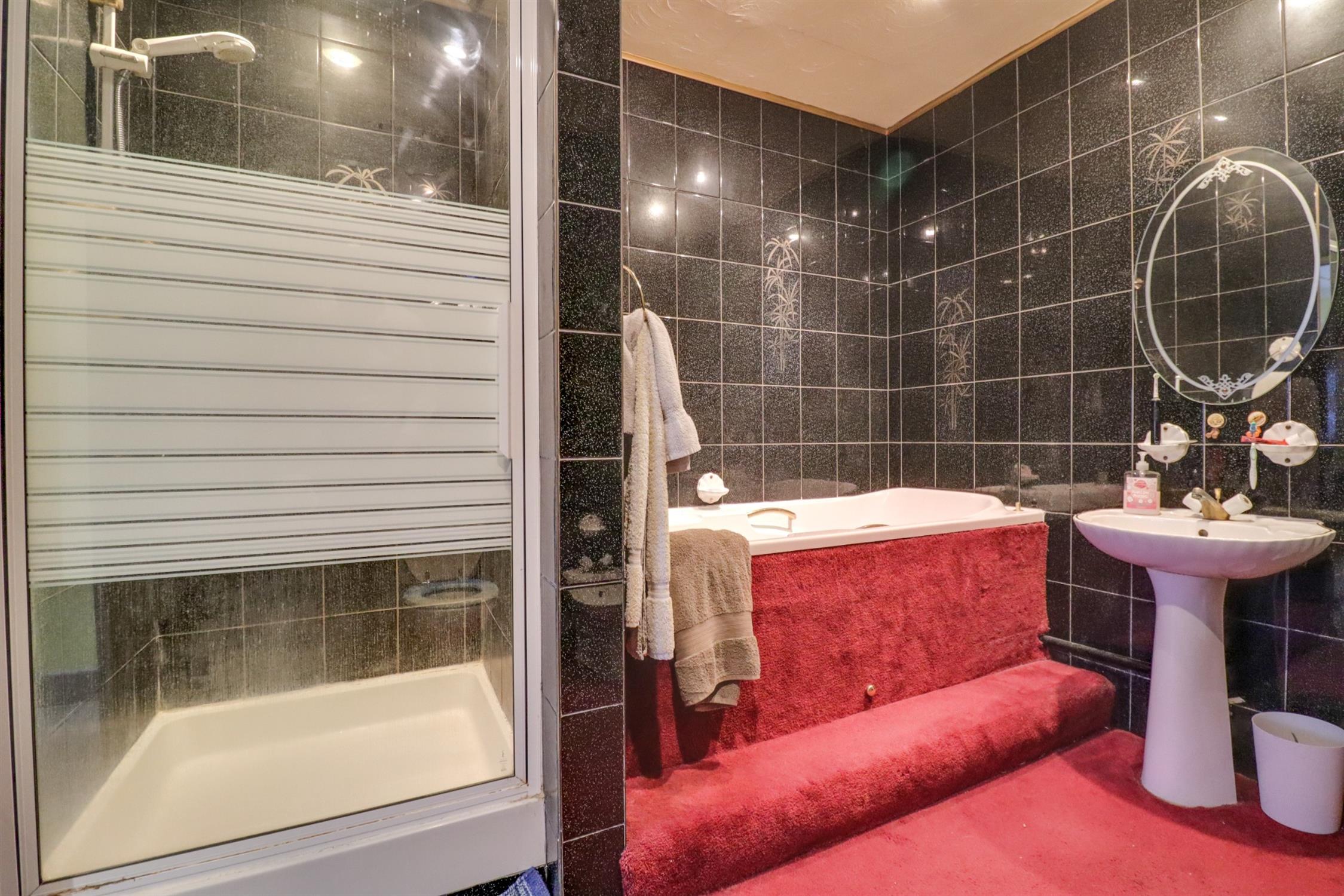 Panel enclosed bath with mixer tap, low level flush w.c. Pedestal sink. Shower cubicle. Bidet. Shaver point. Radiator. Tiled walls. Carpeted flooring