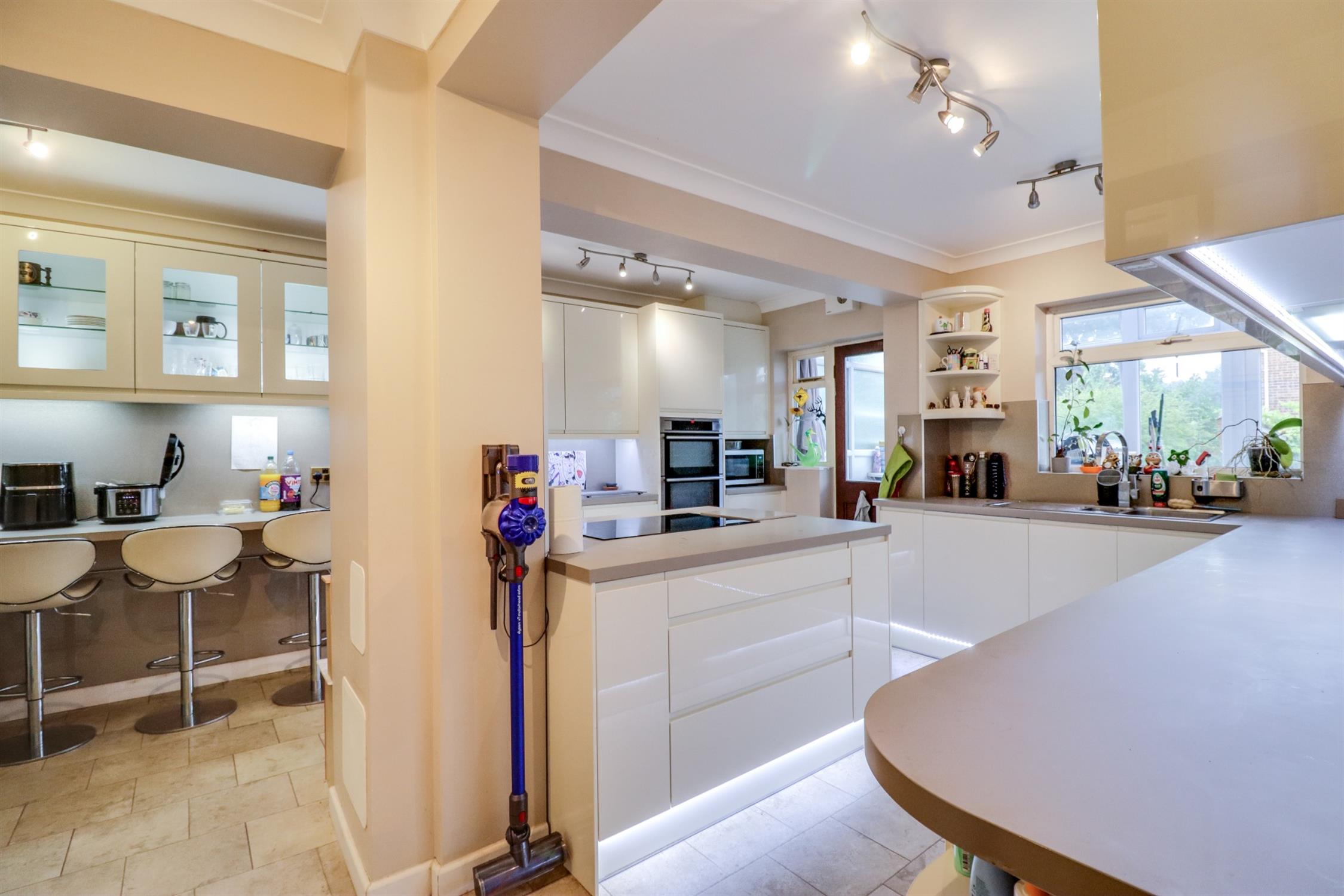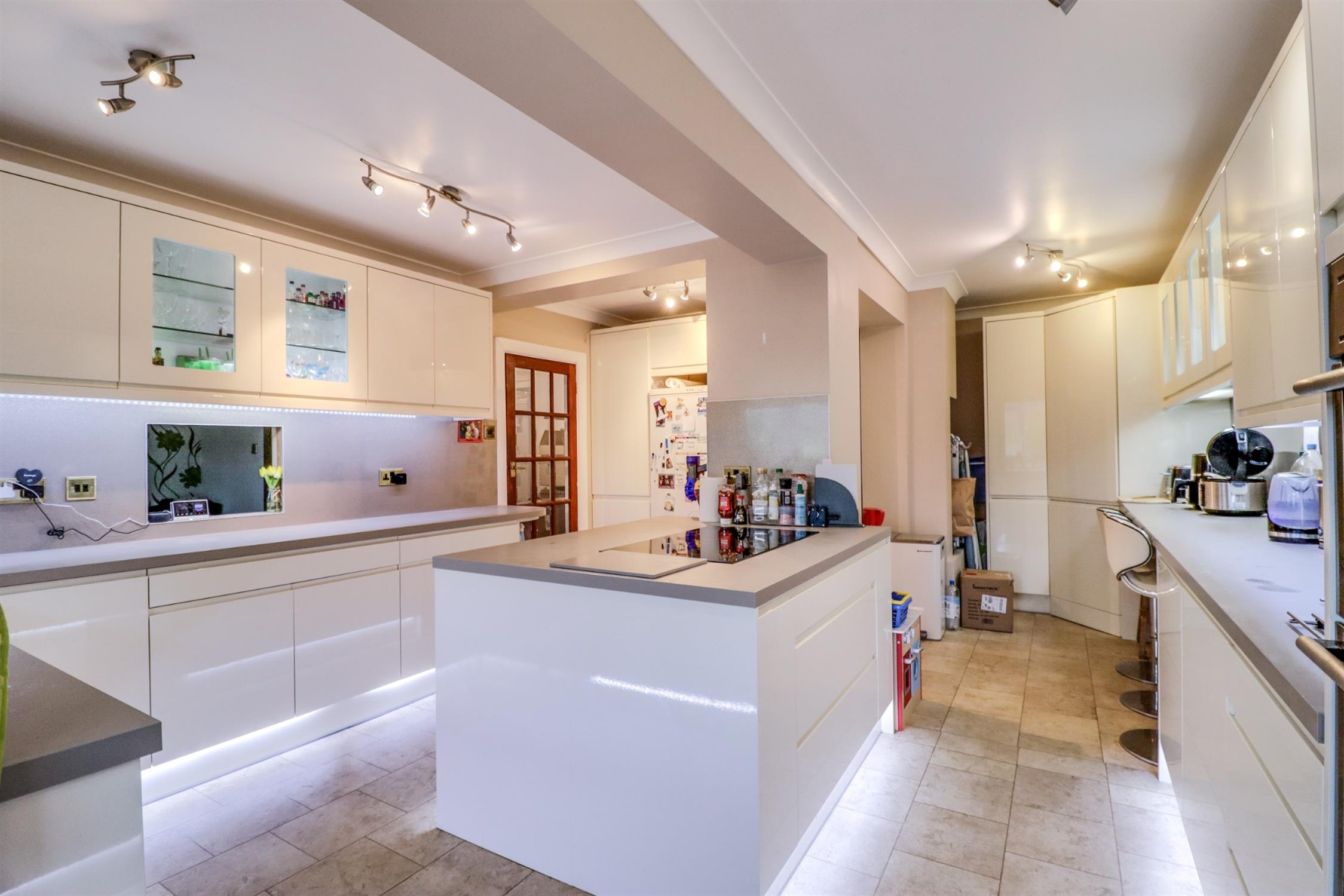 Double-glazed windows to rear aspect. Smooth ceiling. Single drainer one and a half bowl sink unit with mixer tap and cupboard under. A range of matching eye level and base mounted cream finish high gloss units with soft close action and quartz worktops over. Integrated electric double oven and hob, dishwasher. Tiled flooring. Breakfast bar. Under cupboard and baseboard LED lighting. Servers hatch to family room.