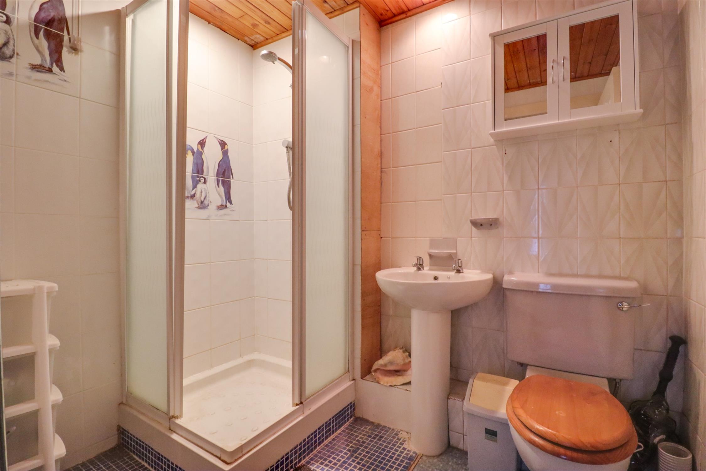 Shower cubicle, low level flush w.c. Pedestal sink. Radiator. Tiled splash backs. Lino flooring
