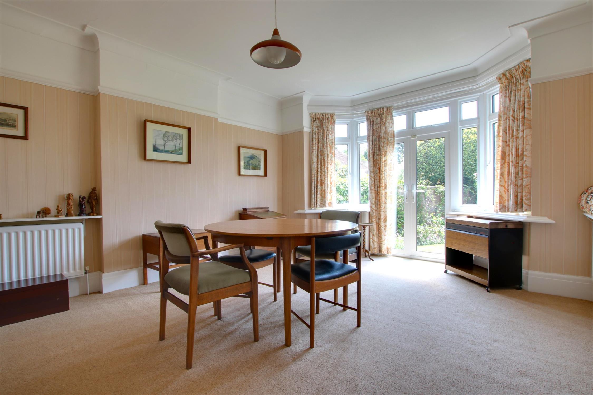 Carpeted. Picture rails. High skirting boards and coving. Triple glazed bay window with double doors leading to garden. Two radiators.