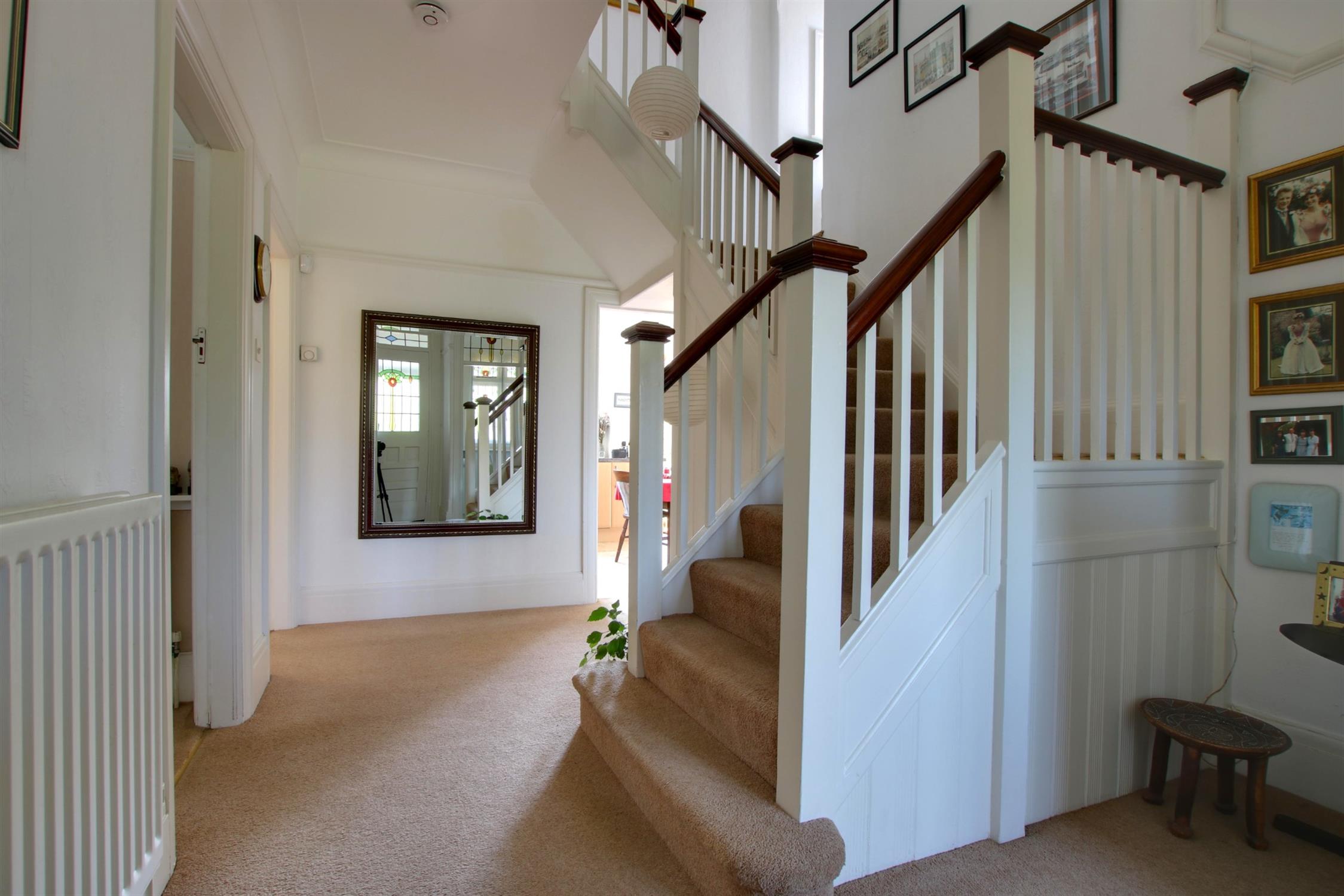 Carpeted. Picture rails. High skirting boards and coving. Doors to all room. Stairs to galleried landing. Under stairs storage cupboard. Radiator.