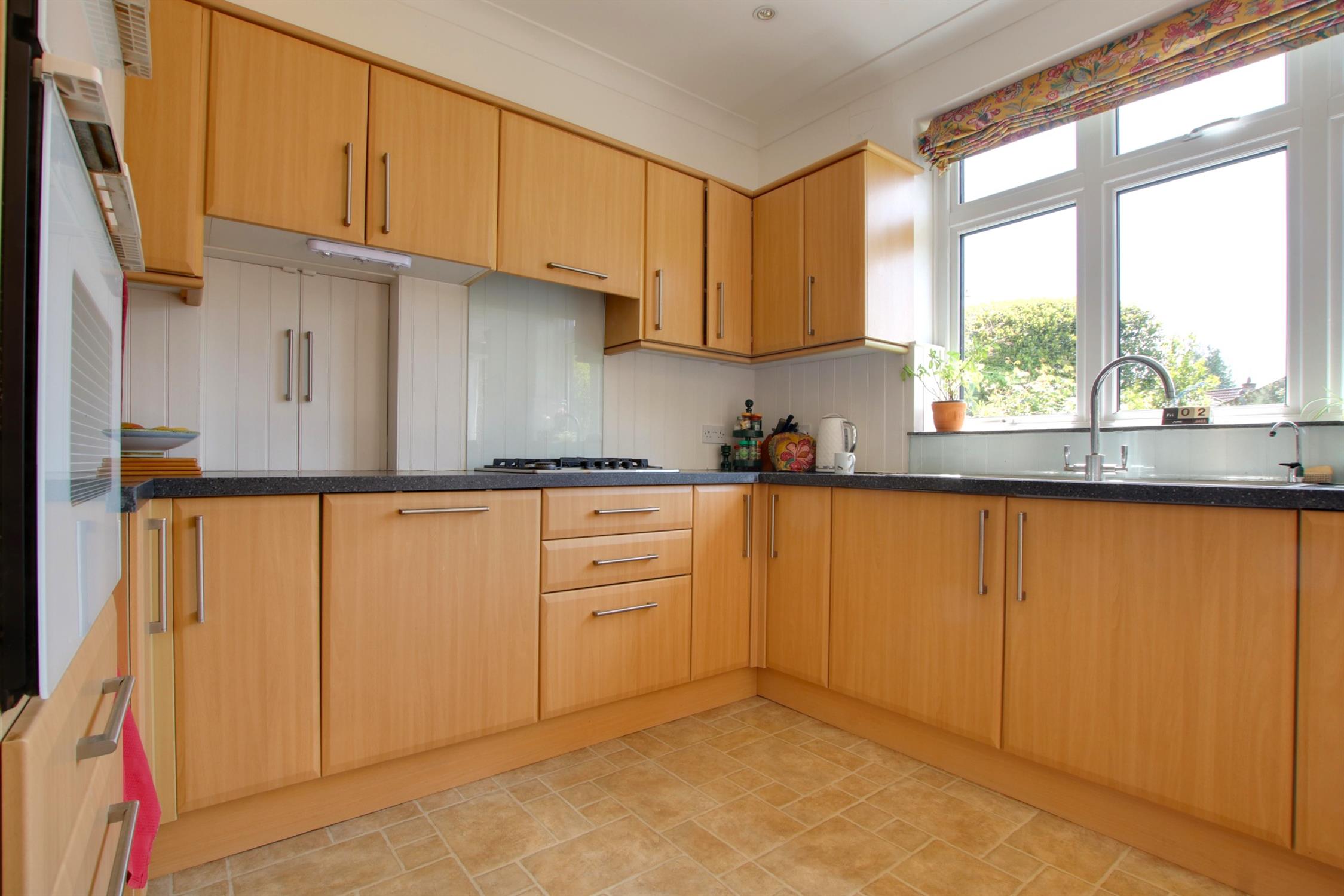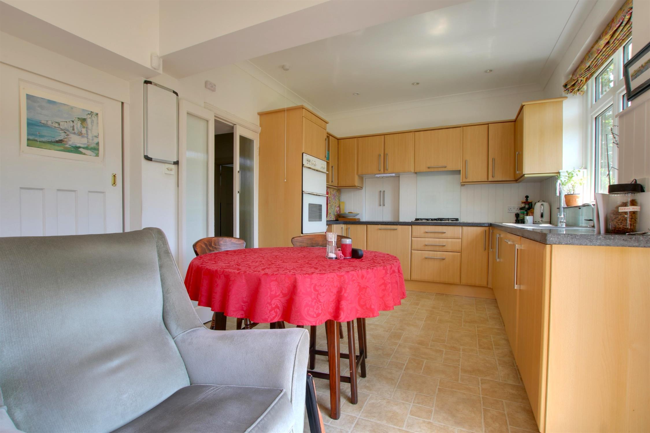 Laminate flooring. Kitchen comprises wall and base units. Glass splashback. Integrated oven, gas hob with extractor, dishwasher and fridge. Inset stainless steel sink. Three storage cupboards which has space for a washing machine and freezer, two of which have sliding doors and one with a traditional door. Triple glazed double doors leading to garden and triple-glazed window to rear aspect. Radiatpr and under unit convector heater.