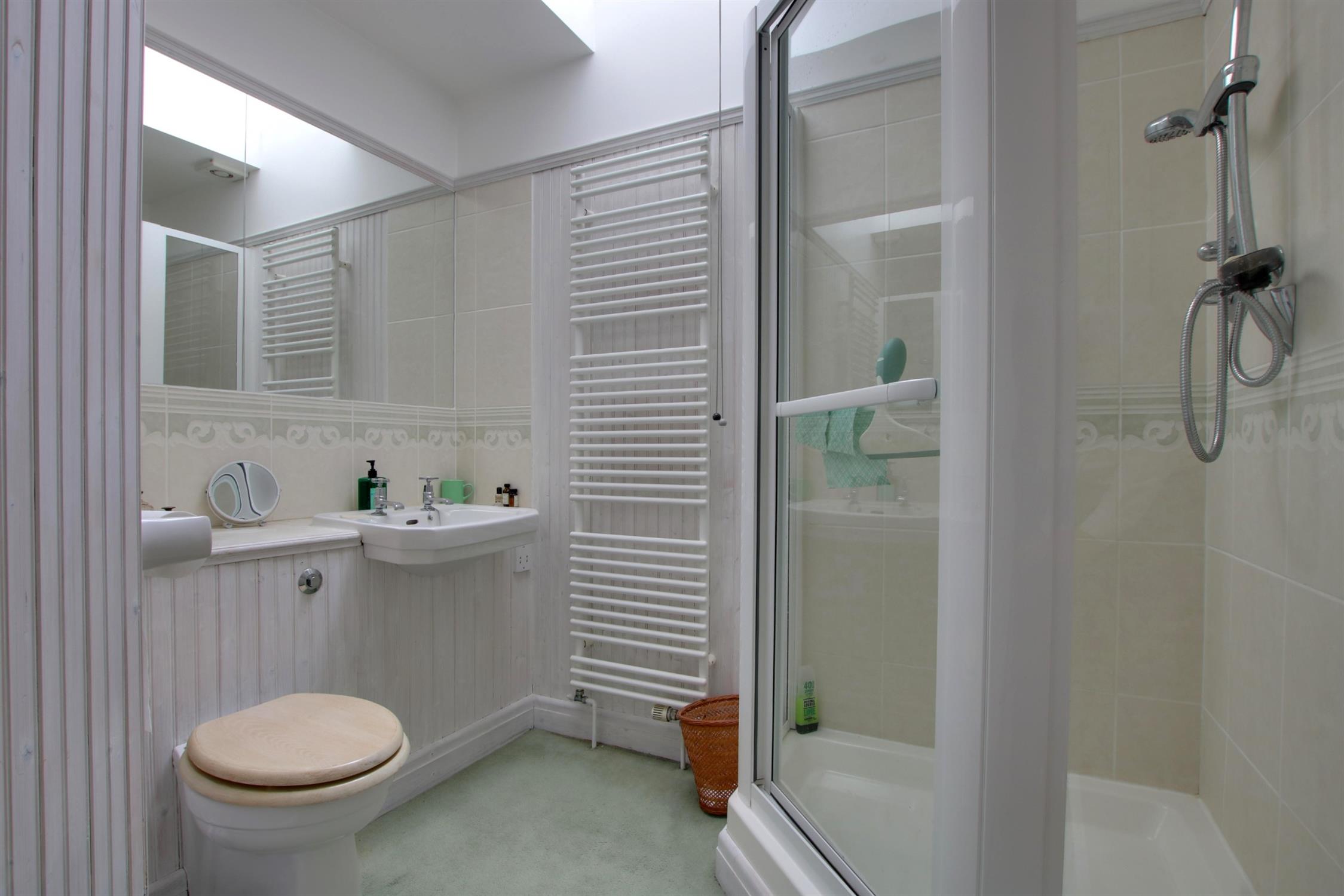 Carpeted. Picture rails. Wood panelled walls and partially tiled walls. Shower cubicle. Low level W.C and basin. Extractor fan. Double-glazed velux window. Heated towel rail.