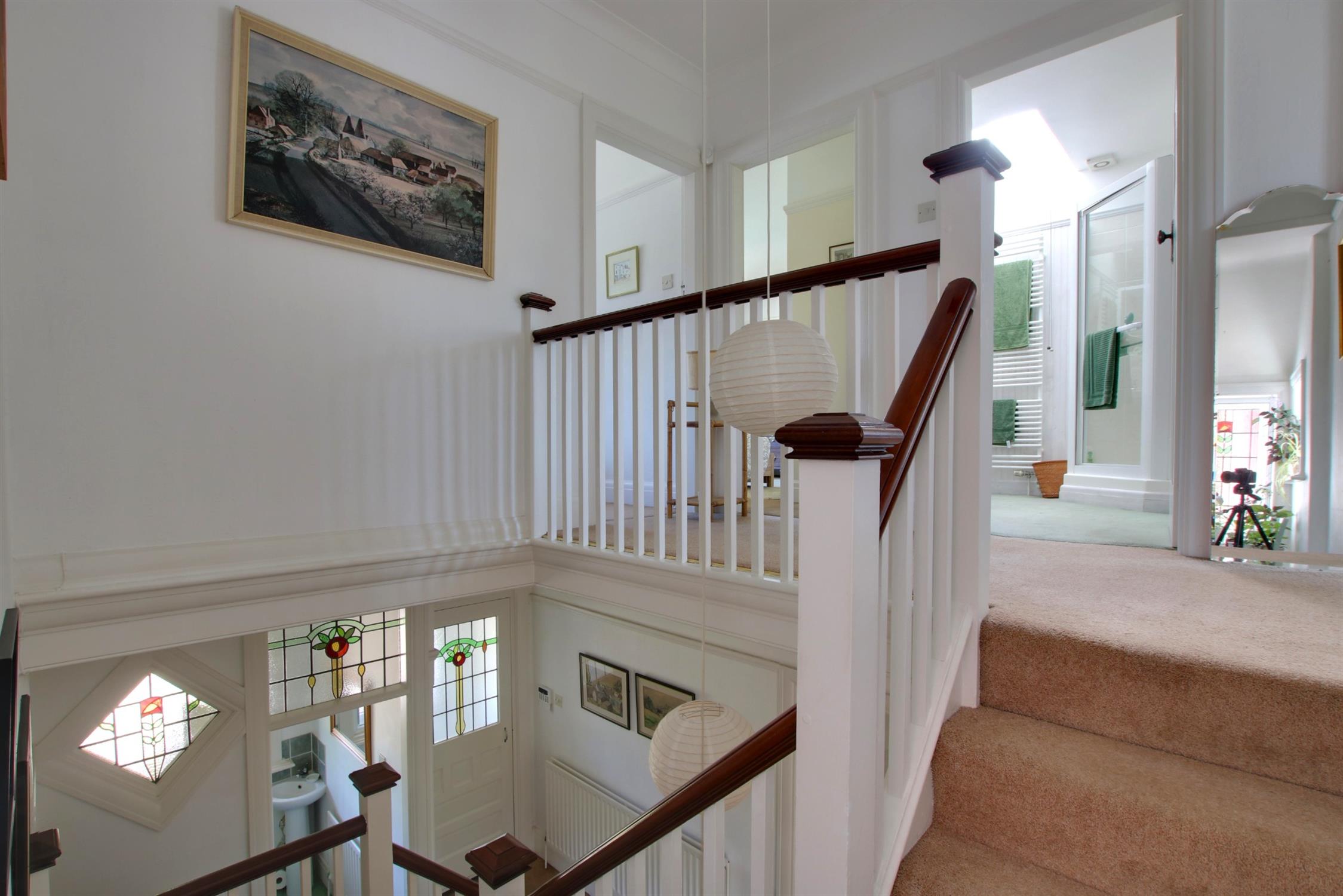 Carpeted. Picture rails. High skirting boards and coving. Doors to all rooms. Single-glazed stained-glass windows with secondary glazing to side and rear aspect.