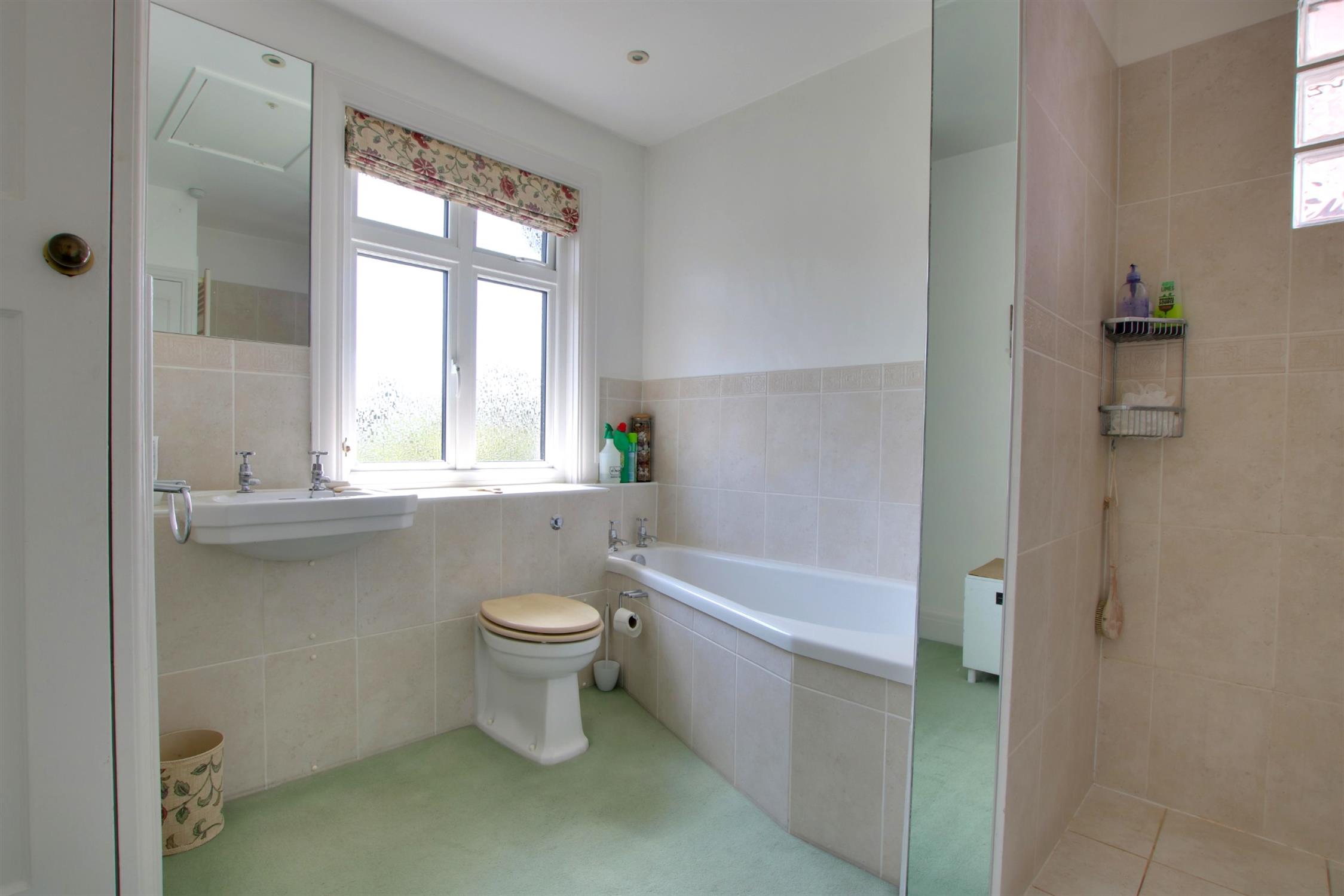 Carpeted. Partially tiled walls. Panel enclosed bath. Low level W.C and basin. Walk in shower. Cupboard housing boiler and hot water tank. Obscure triple-glazed window to rear aspect. Heated towel rail.
