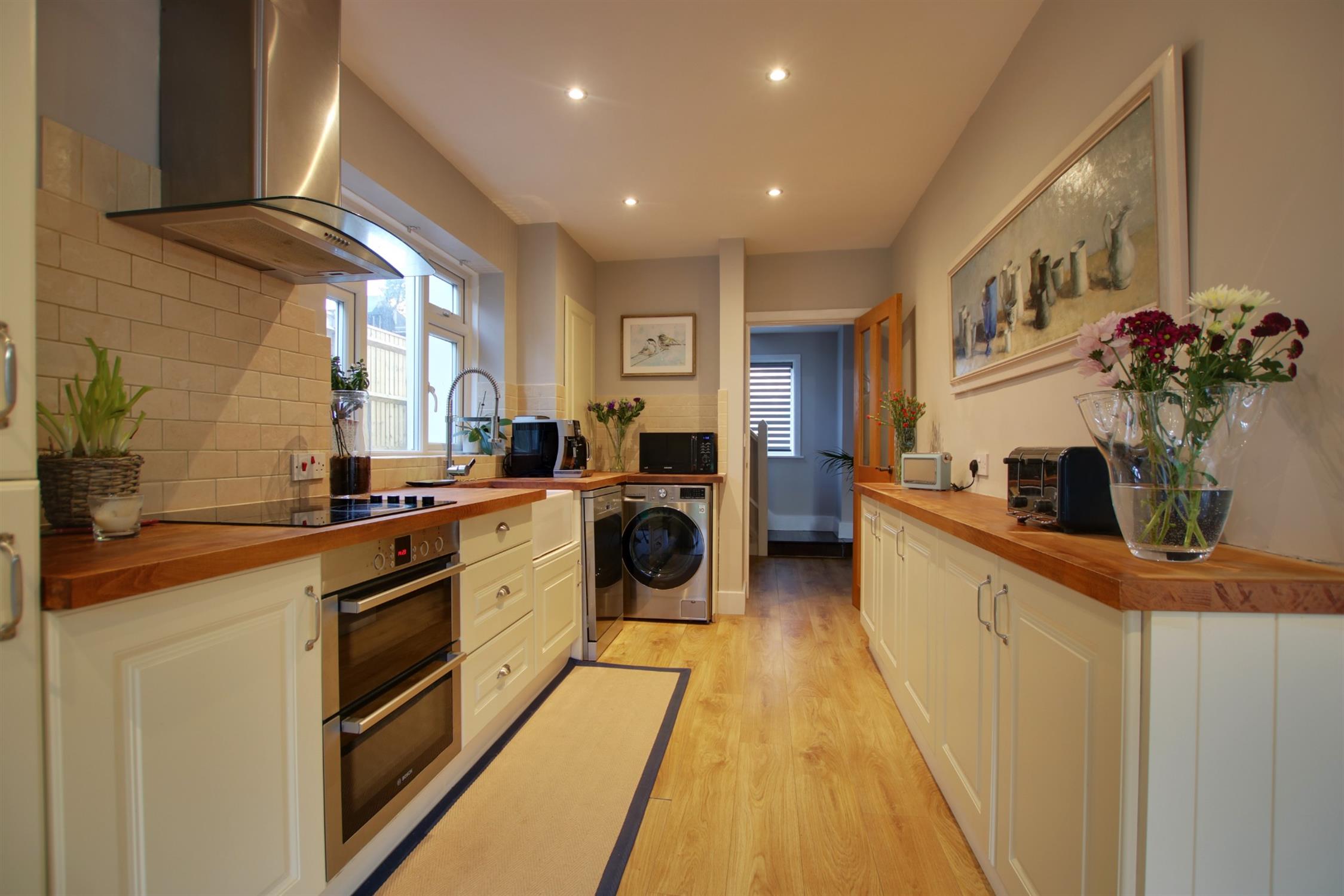 A range of units to include built-in double oven with electric hob and stainless steel glass chimney style extractor hood over. Under laid sink. Tiled splash backs. Suitable space and plumbing for automatic washing machine and dishwasher. Butchers block style worktop surfaces. Smooth plastered ceiling with recessed lighting. Double glazed window to side elevation.