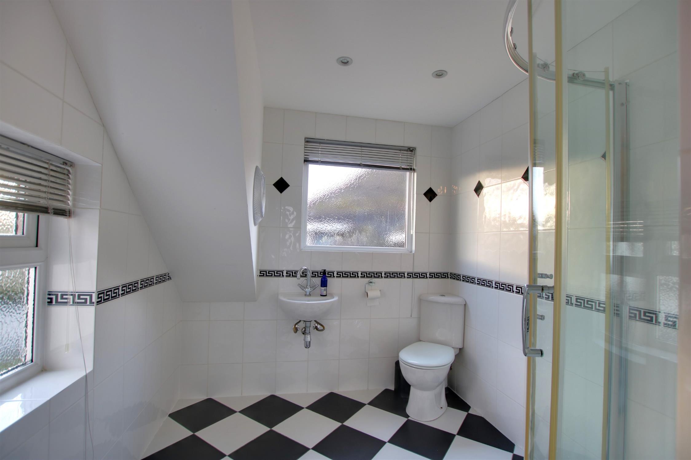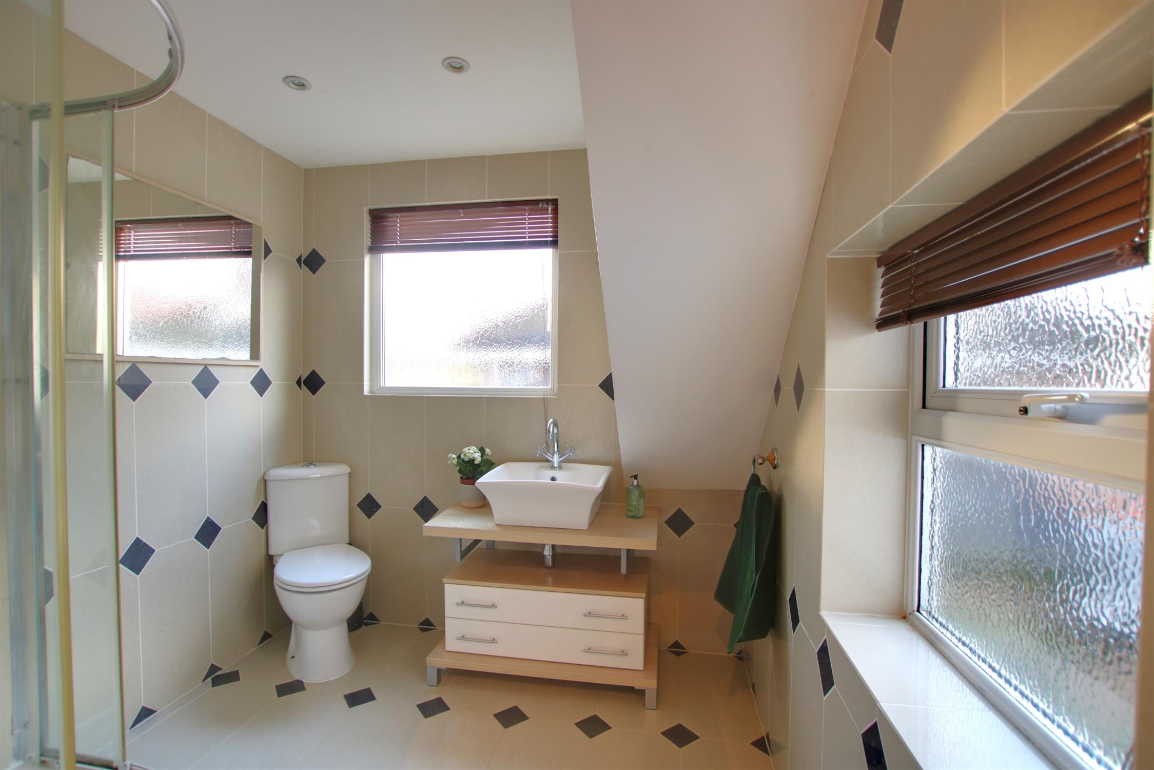 Contemporary re-fitted suite comprising; quadrant style shower, corner mounted low level w.c., contemporary counter top mounted sink with drawer storage under. Two obscure double glazed windows. Smooth plastered ceiling with recessed lighting. Tiled wall surfaces and tiled flooring with underfloor heating.