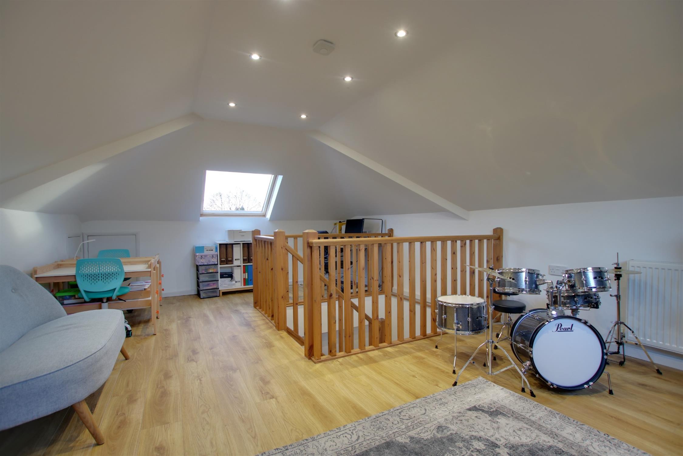 Returning stair case leading to the second floor with galleried spindle balustrade landing area. Two velux double glazed windows. Smooth plastered ceiling with recessed lighting. Access to eaves storage. Two radiators. Wood flooring.