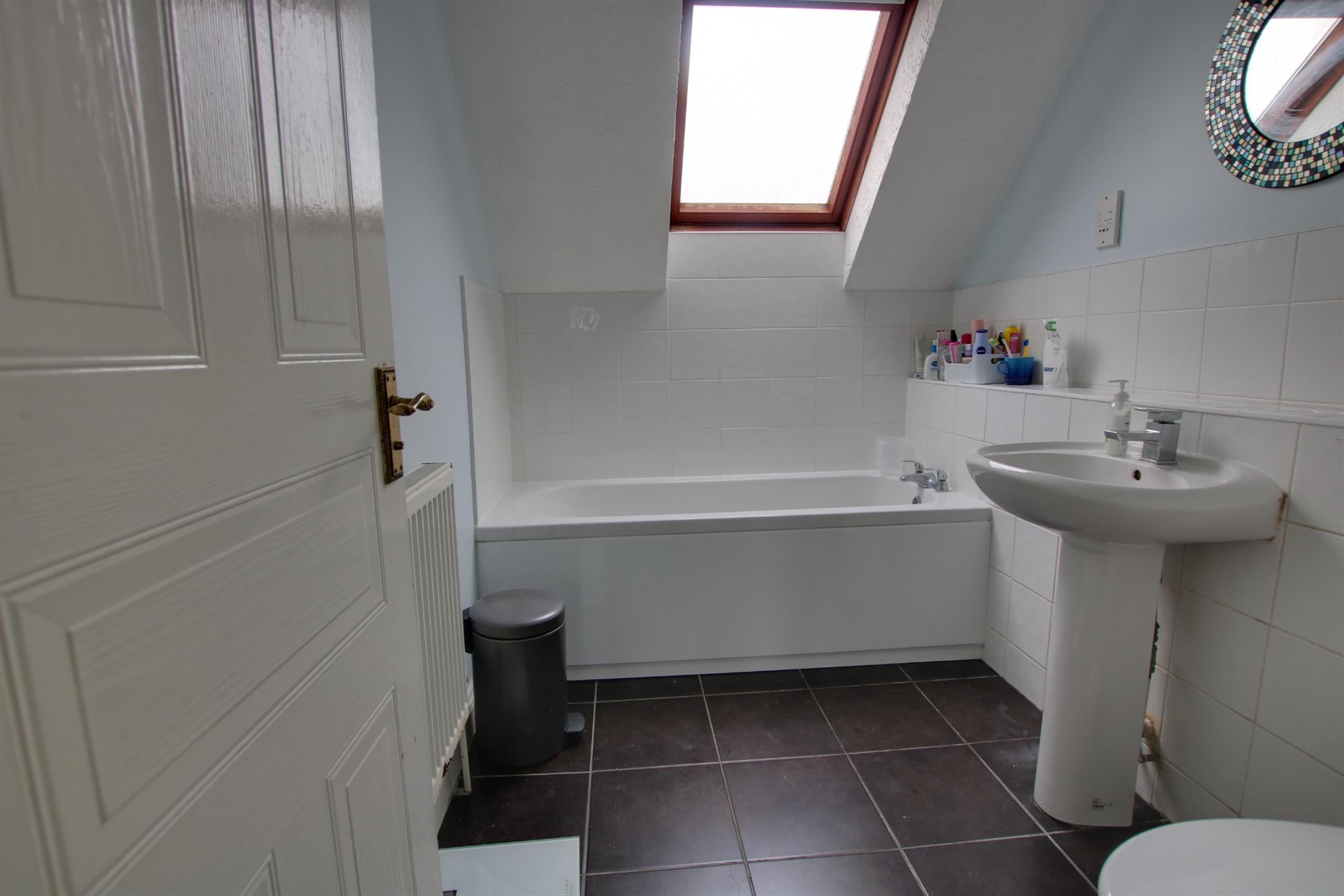 Double glazed obscure glass velux window to rear aspect. Textured ceiling. Panel enclosed bath with mixer tap, pedestal wash basin with mixer tap and low level flush w.c. Part tiled walls. Shaver point. Tiled flooring. Radiator.