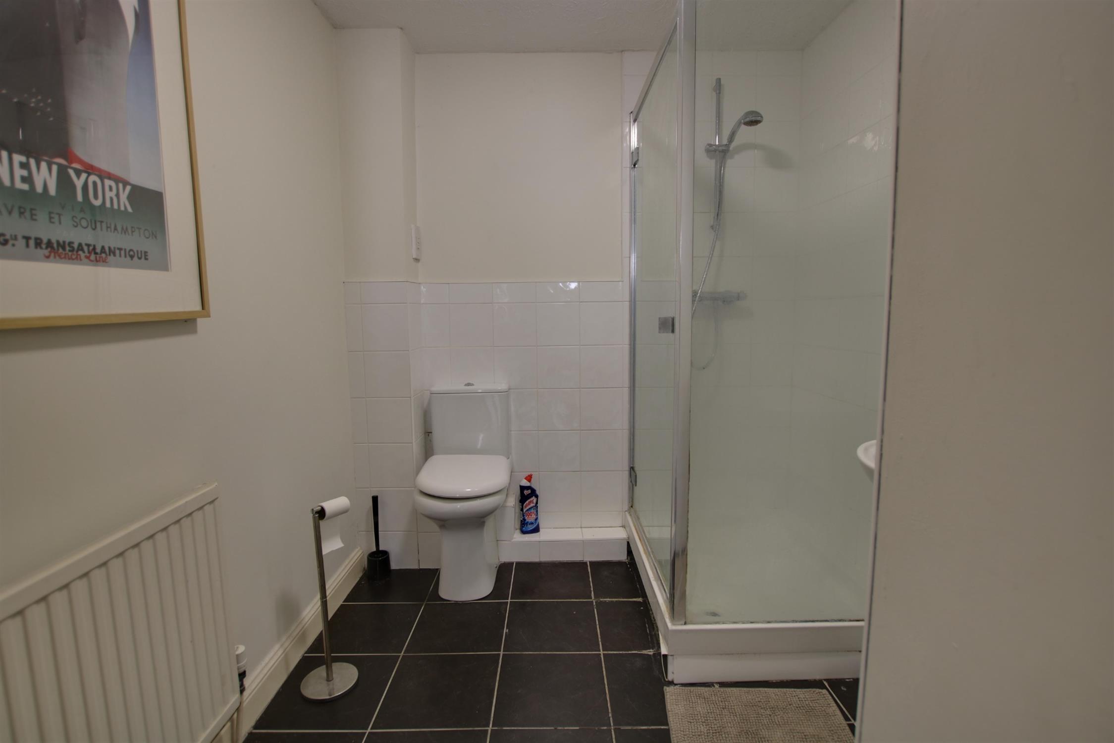 Textured ceiling. Extractor. Tiled shower cubicle, pedestal wash basin with mixer tap and low level flush w.c. Radiator. Part tiled walls. Tiled flooring.