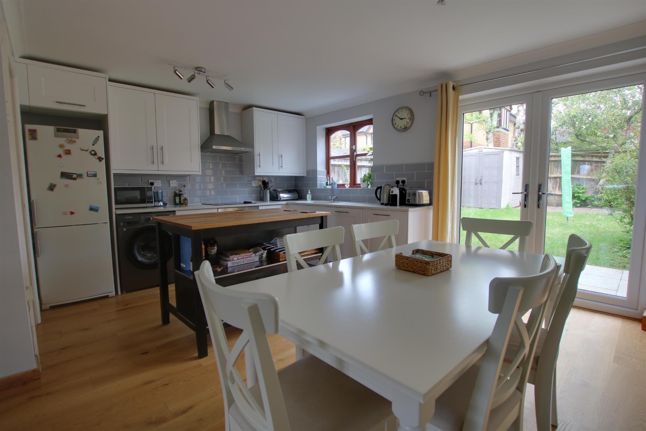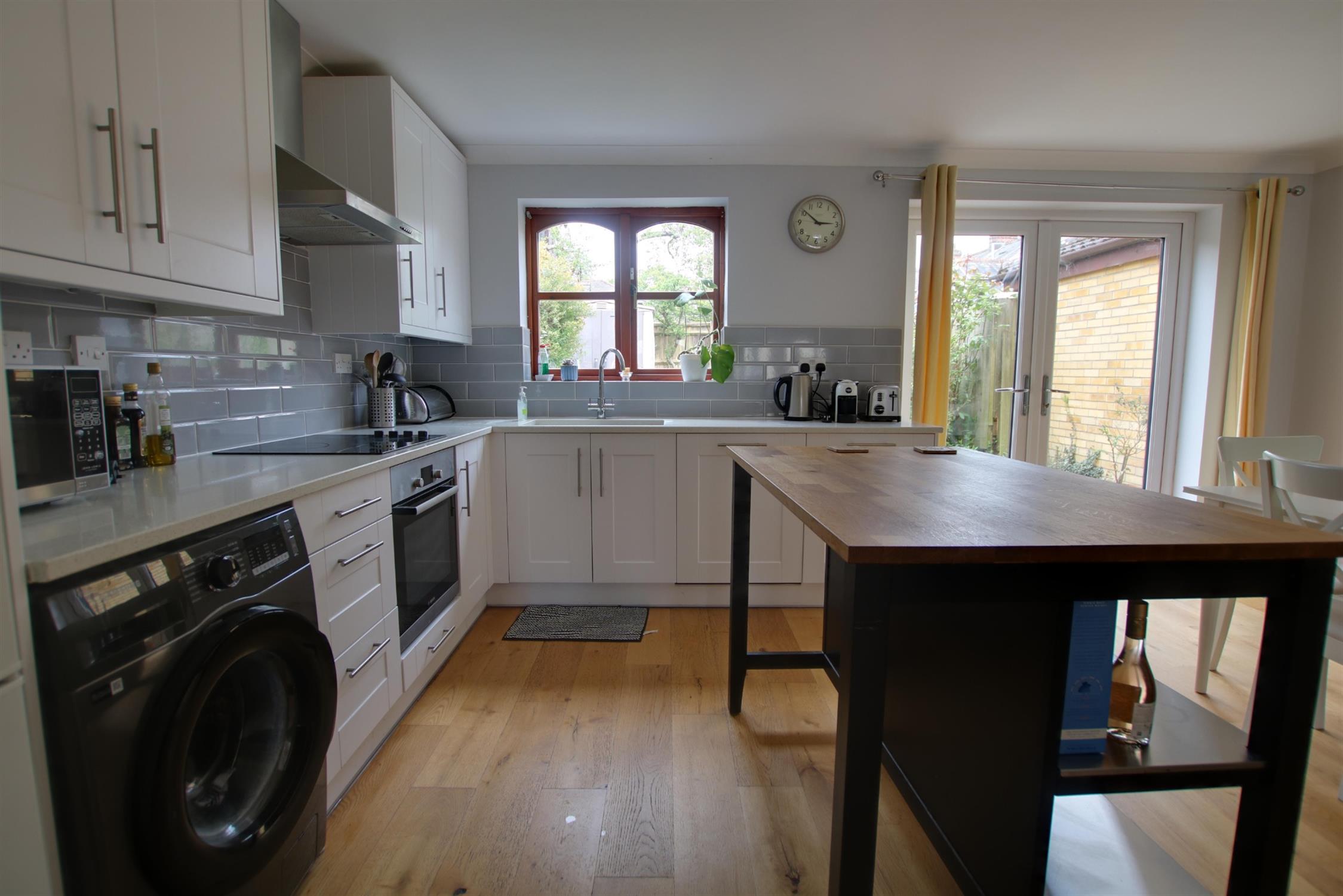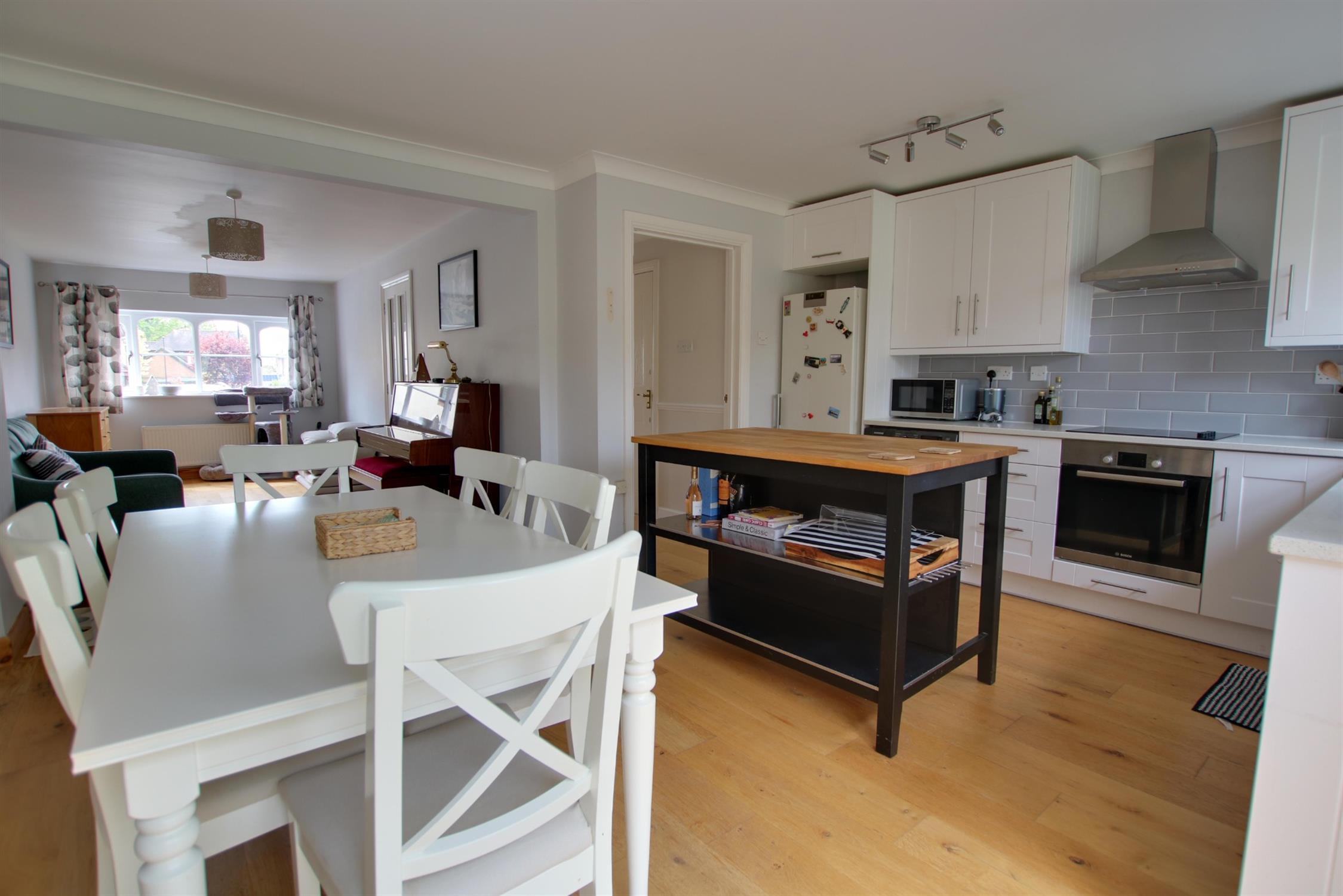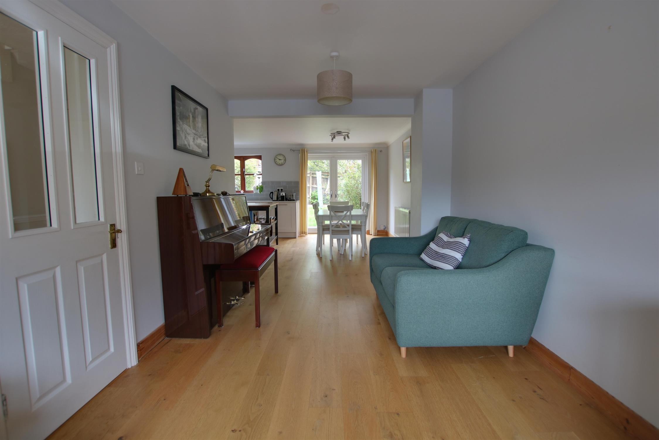 Double glazed window. Double glazed French doors to rear aspect. Coving to smooth ceiling. Range Master sink unit with swan neck mixer tap and cupboard under. A range of matching eye level and base mounted units with soft close action and quartz worktop over. Built-in oven with fitted four ring electric hob and extractor over. Integrated dishwasher. Space for fridge/freezer. Space and plumbing for washing machine. Radiator. Engineered wood flooring.