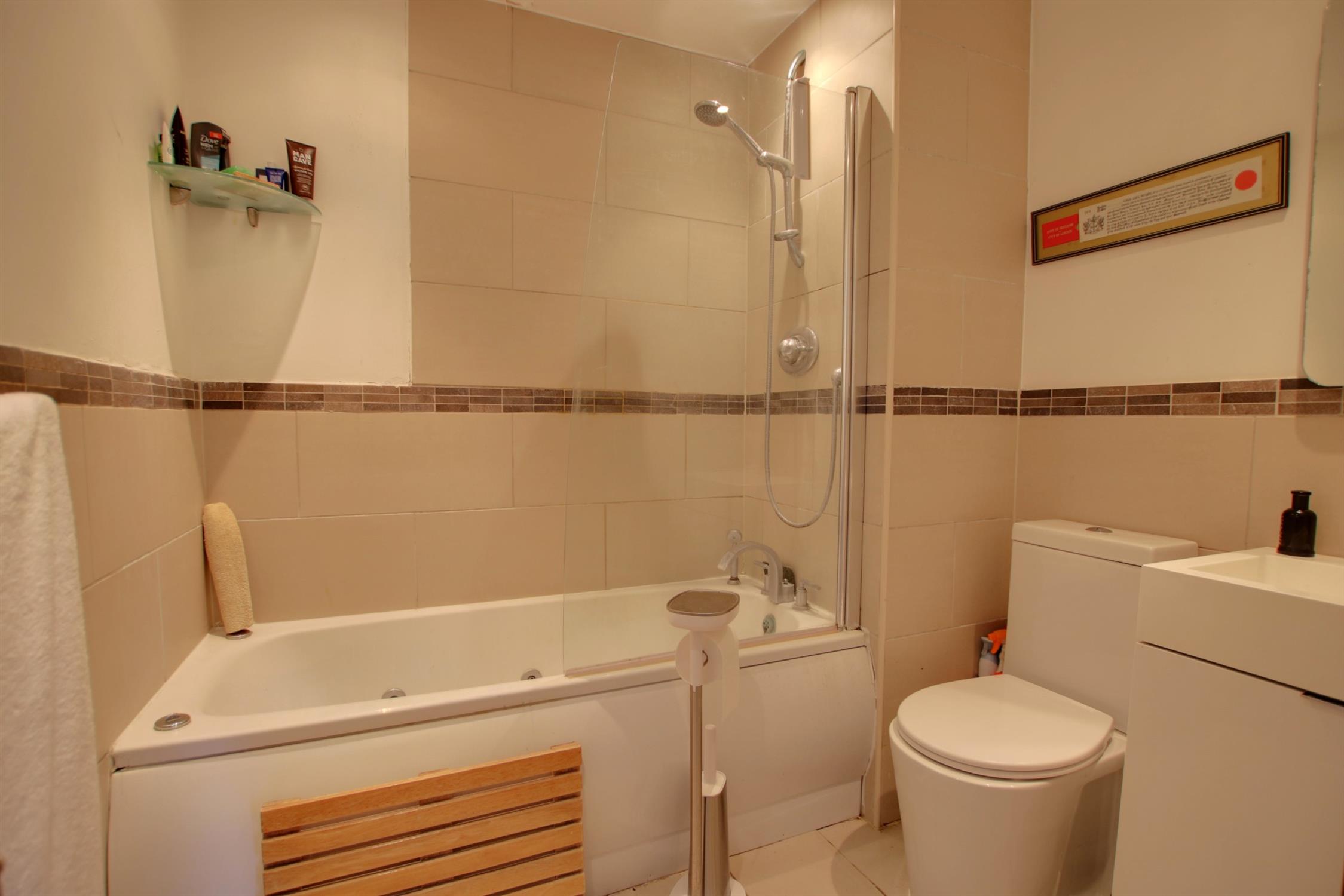 Smooth ceiling with recessed lighting. Extractor. Vanity wash basin with mixer tap and cupboard under, low level flush w.c. and jacuzzi bath with mixer tap and shower over. Heated towel rail. Part tiled walls. Tiled flooring.