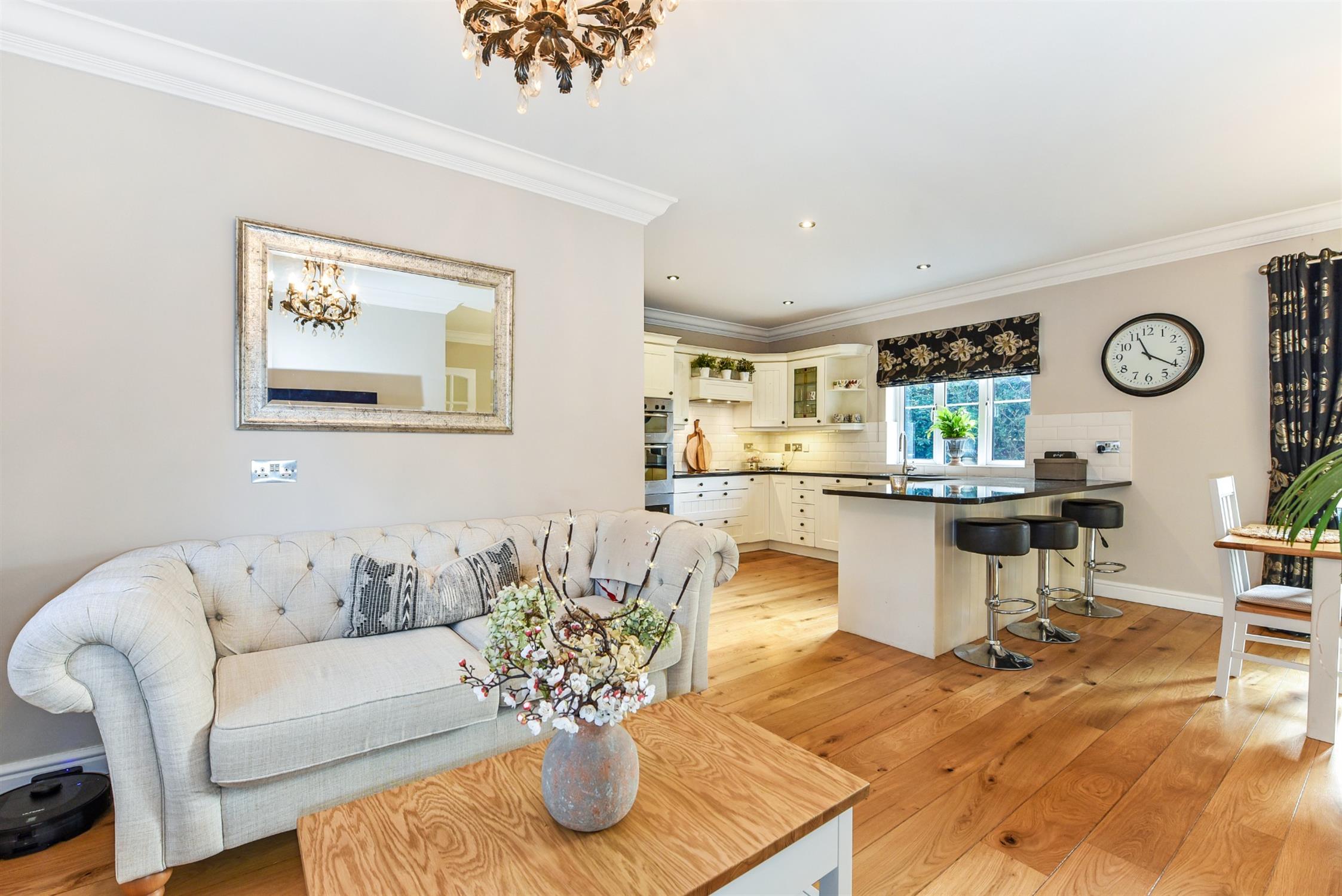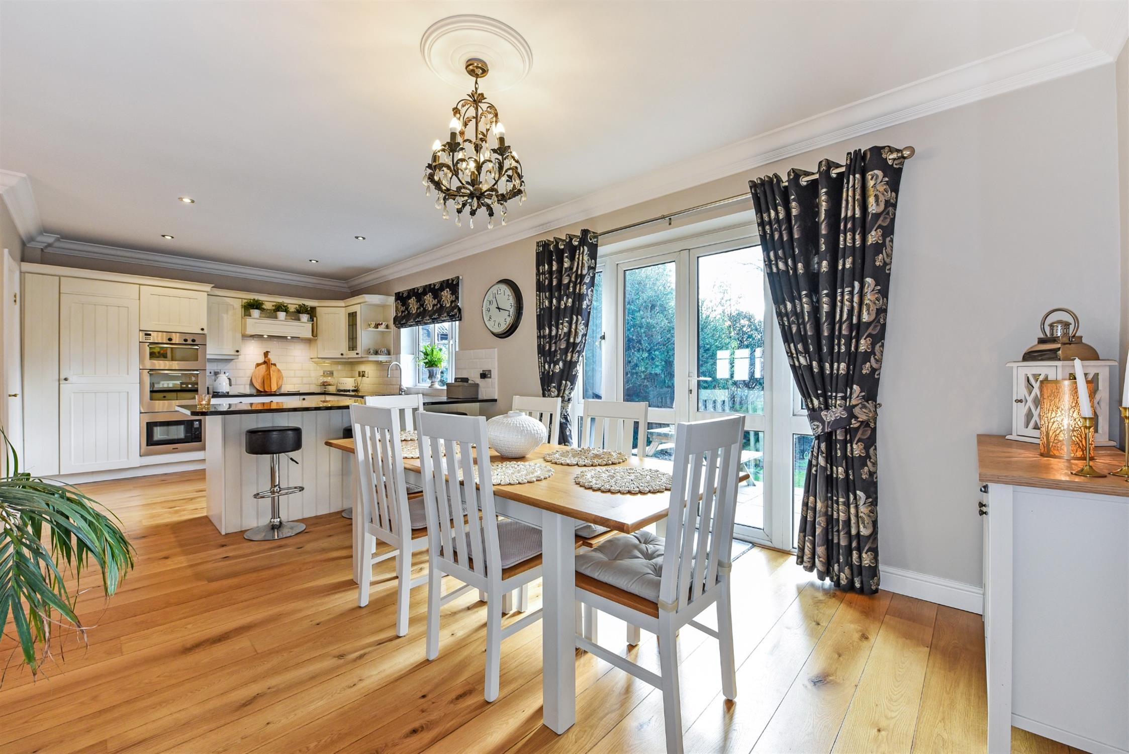 Double glazed windows to front and rear aspects. Double glazed French doors opening onto rear garden. Coving to smooth ceiling with recessed lighting. Two radiators. Oak flooring. One and a half bowl sink unit with mixer tap and cupboard under. A range of matching eye level and base mounted units with granite work surface over. Integrated dishwasher. Built-in double oven and microwave. Fitted induction hob with extractor over. Integrated full height fridge. Door to:-
