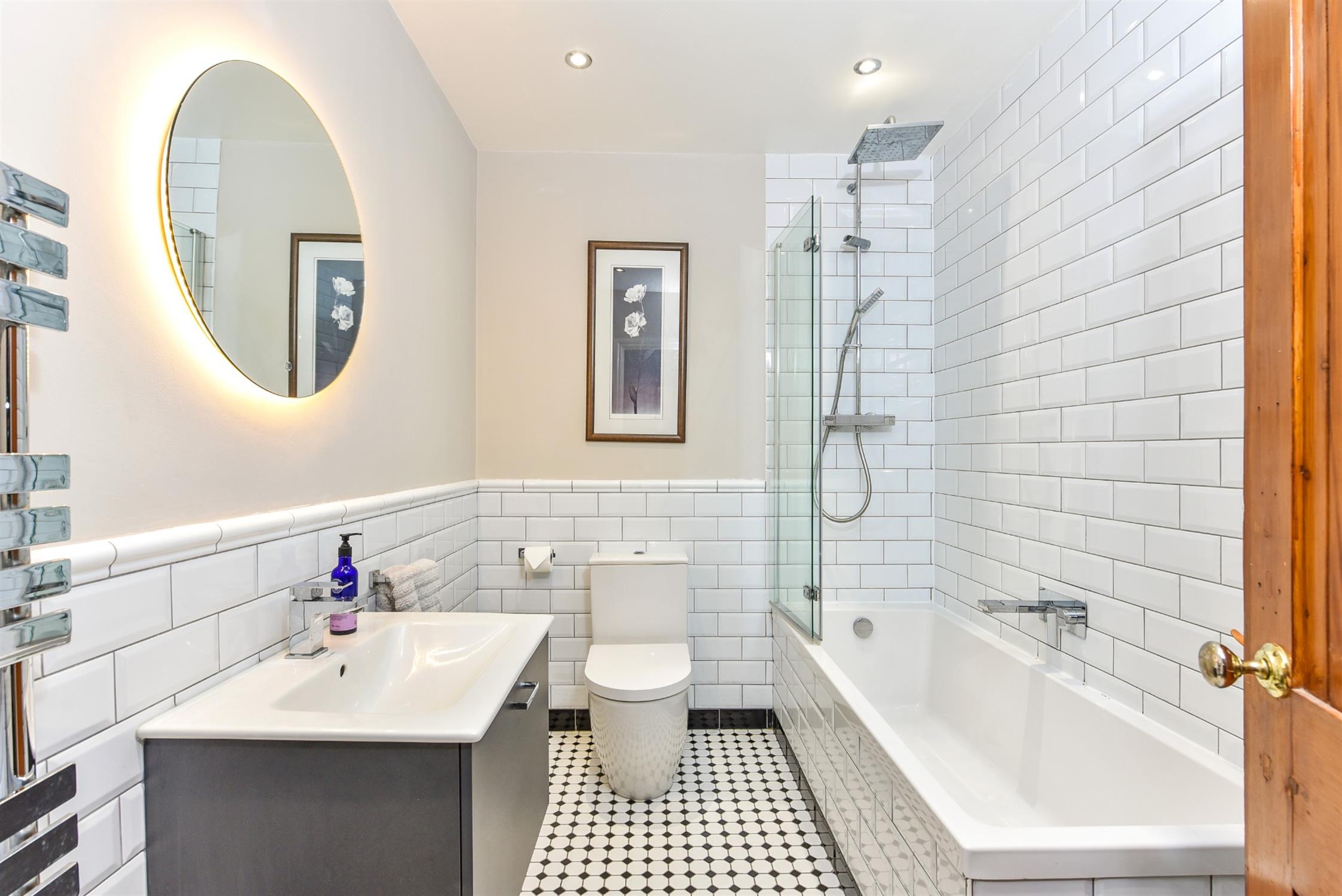 Smooth ceiling with recessed lighting. Extractor. Vanity wash basin with mixer tap and drawer under and bath with central mixer tap, rainfall shower head and shower attachment. Heated towel rail. Part tiled walls. Tiled flooring.