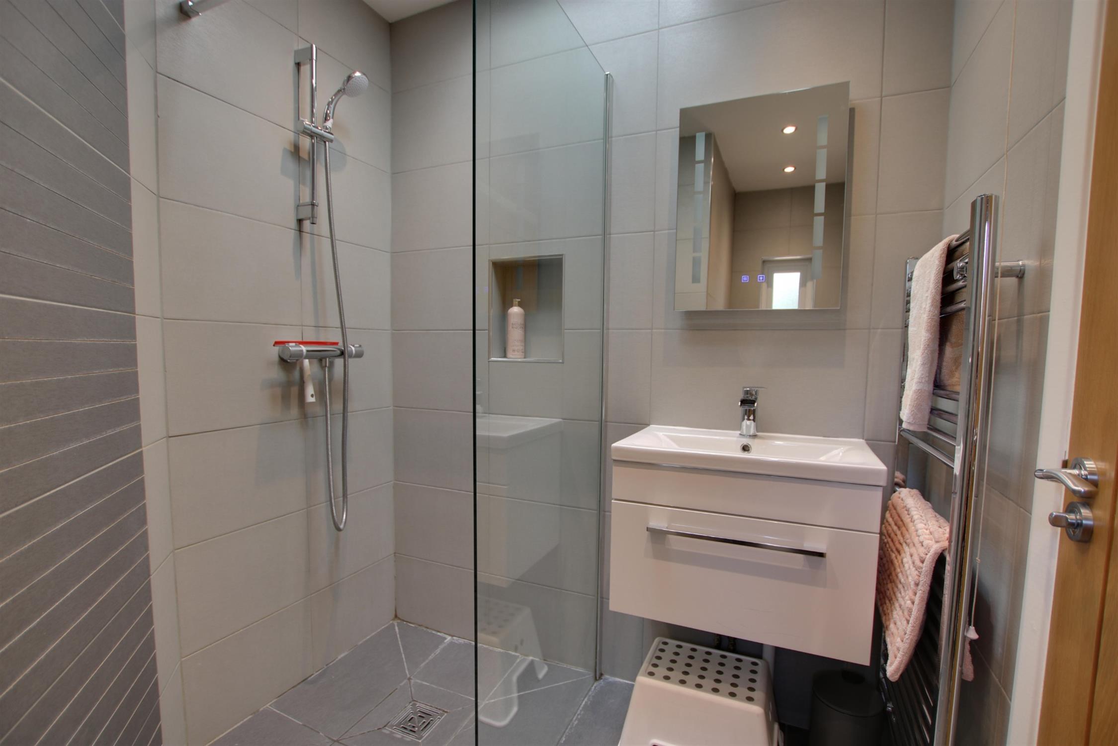 Double glazed obscure glass window to side aspect. Double glazed velux window to side aspect. Tiled walk-in shower cubicle, vanity wash basin with waterfall mixer tap and drawers under and low level flush w.c. Part tiled walls. Tiled flooring. Underfloor heating.